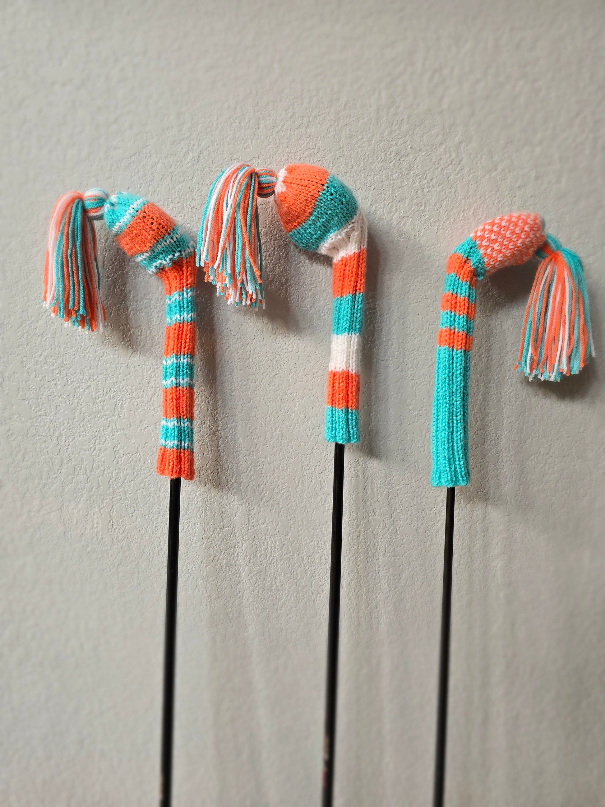 Three Hand Knit Golf Club Head Covers Retro-Vintage Orange, Blue & White with Tassels for Drivers, Woods
