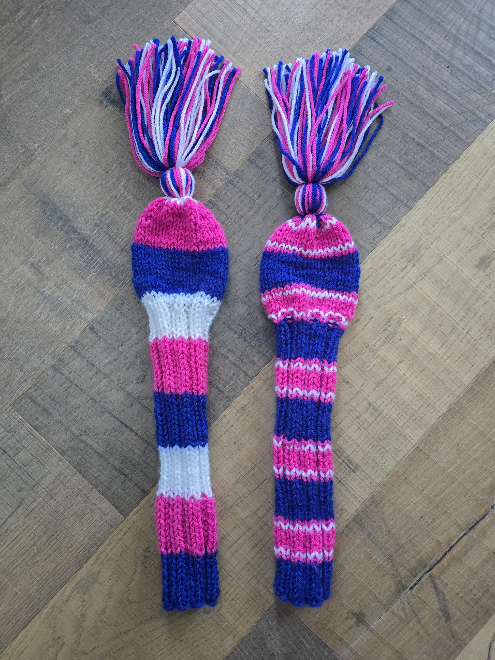 Two Golf Club Head Covers Retro-Vintage Pink, Blue & White with Tassels for Fairway Woods