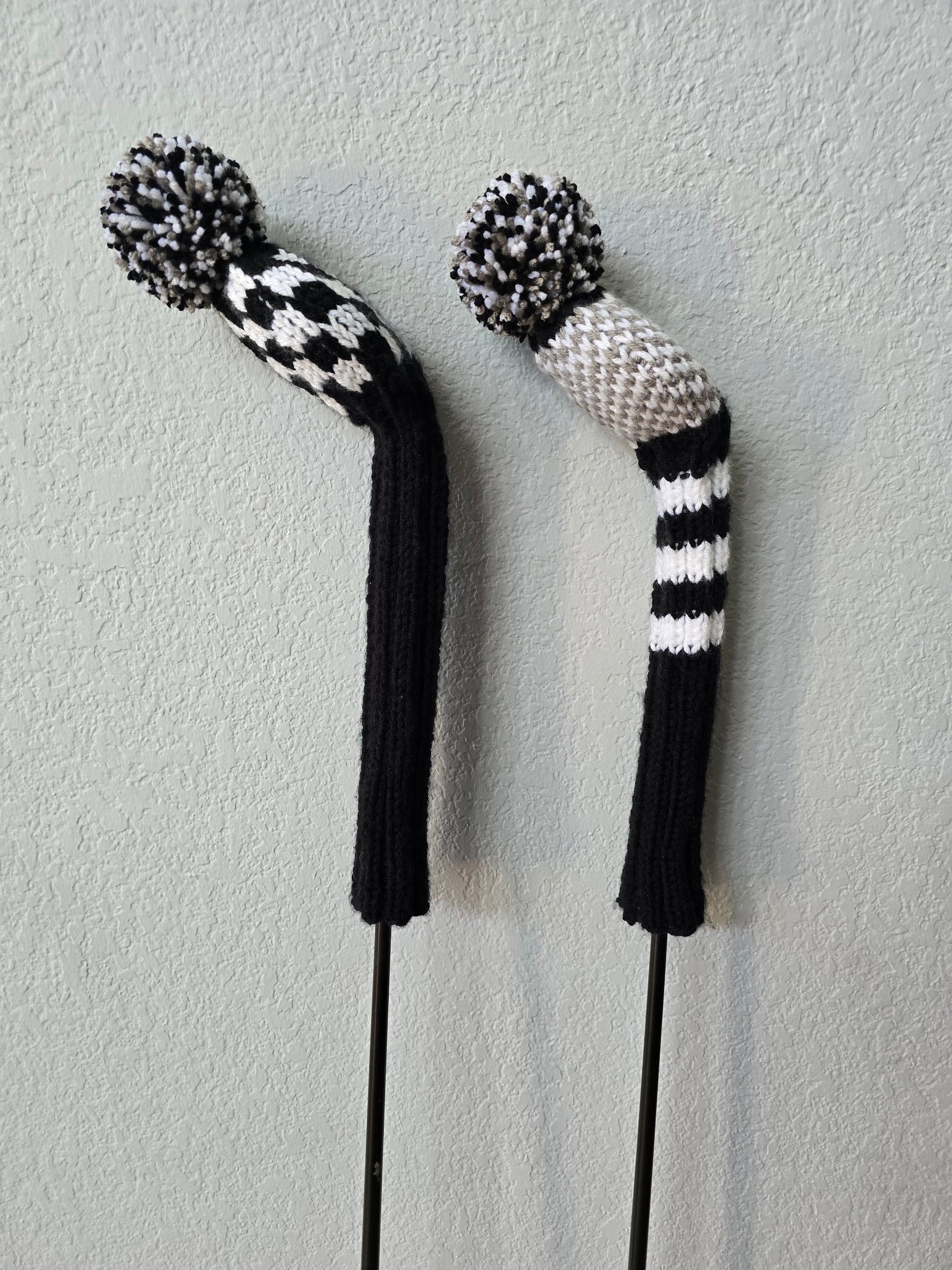 Expertly crafted from hand-knitted materials, these black and white golf club covers feature playful pom poms and provide optimal protection for your fairway woods. Boasting a stylish design and durable construction, they are a must-have for any avid golfer. Keep your clubs safe and add a touch of whimsy to your game with these covers.This is the perfect accessory for any golfer!
