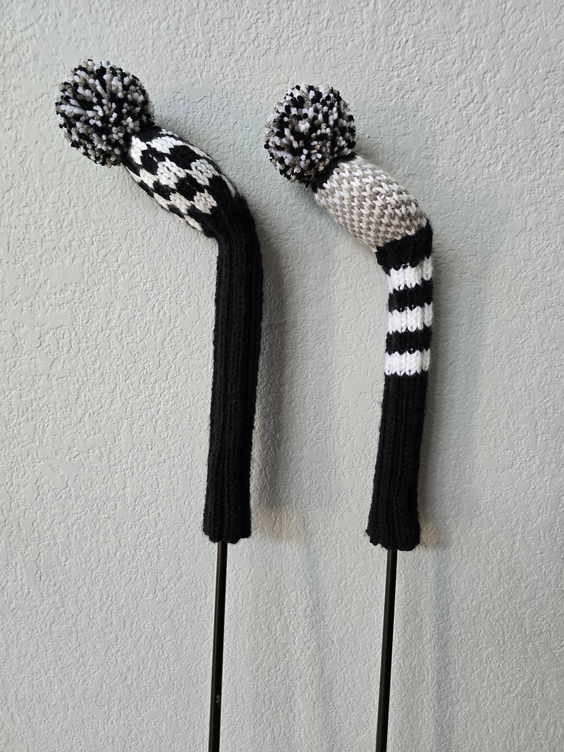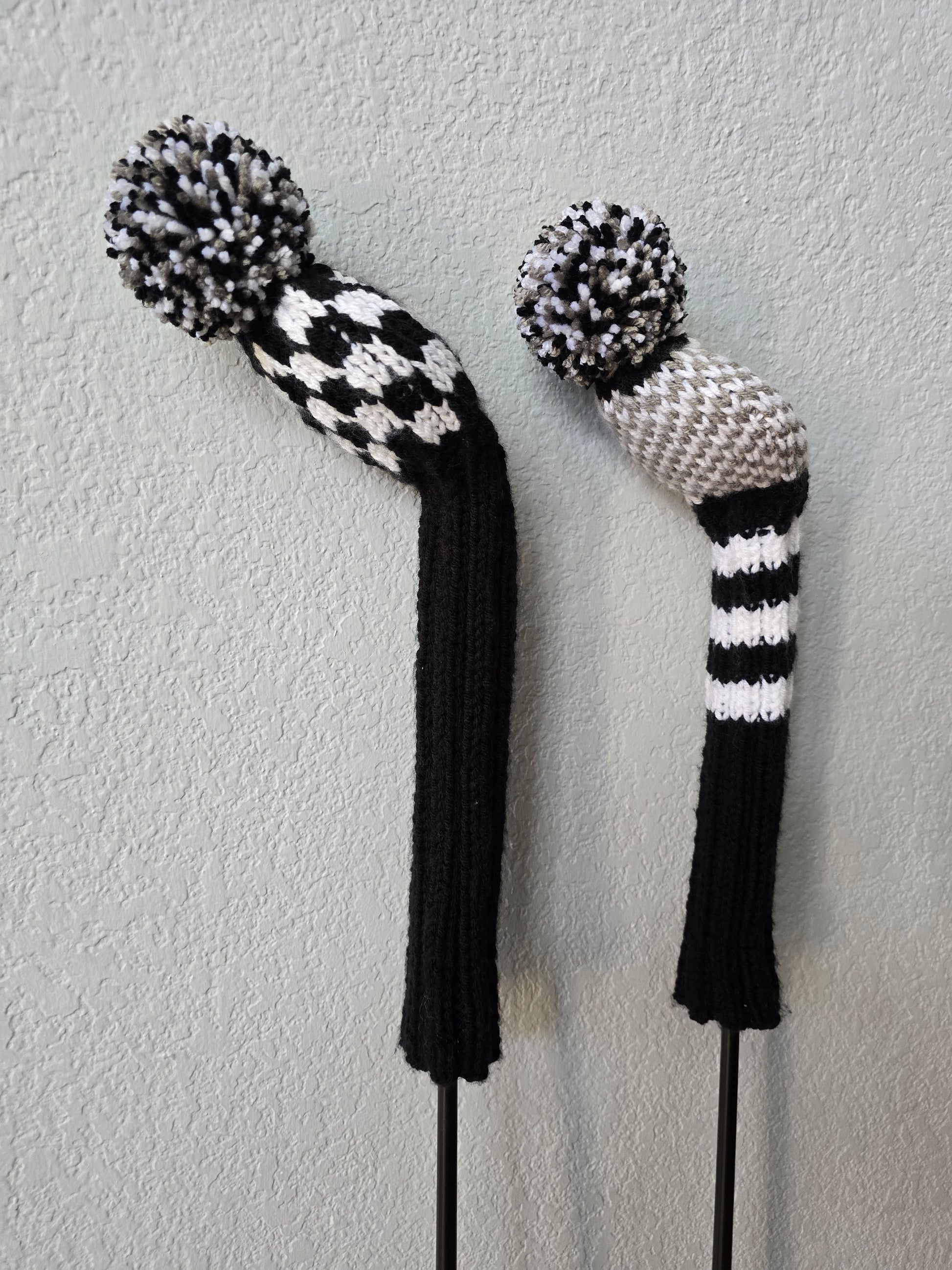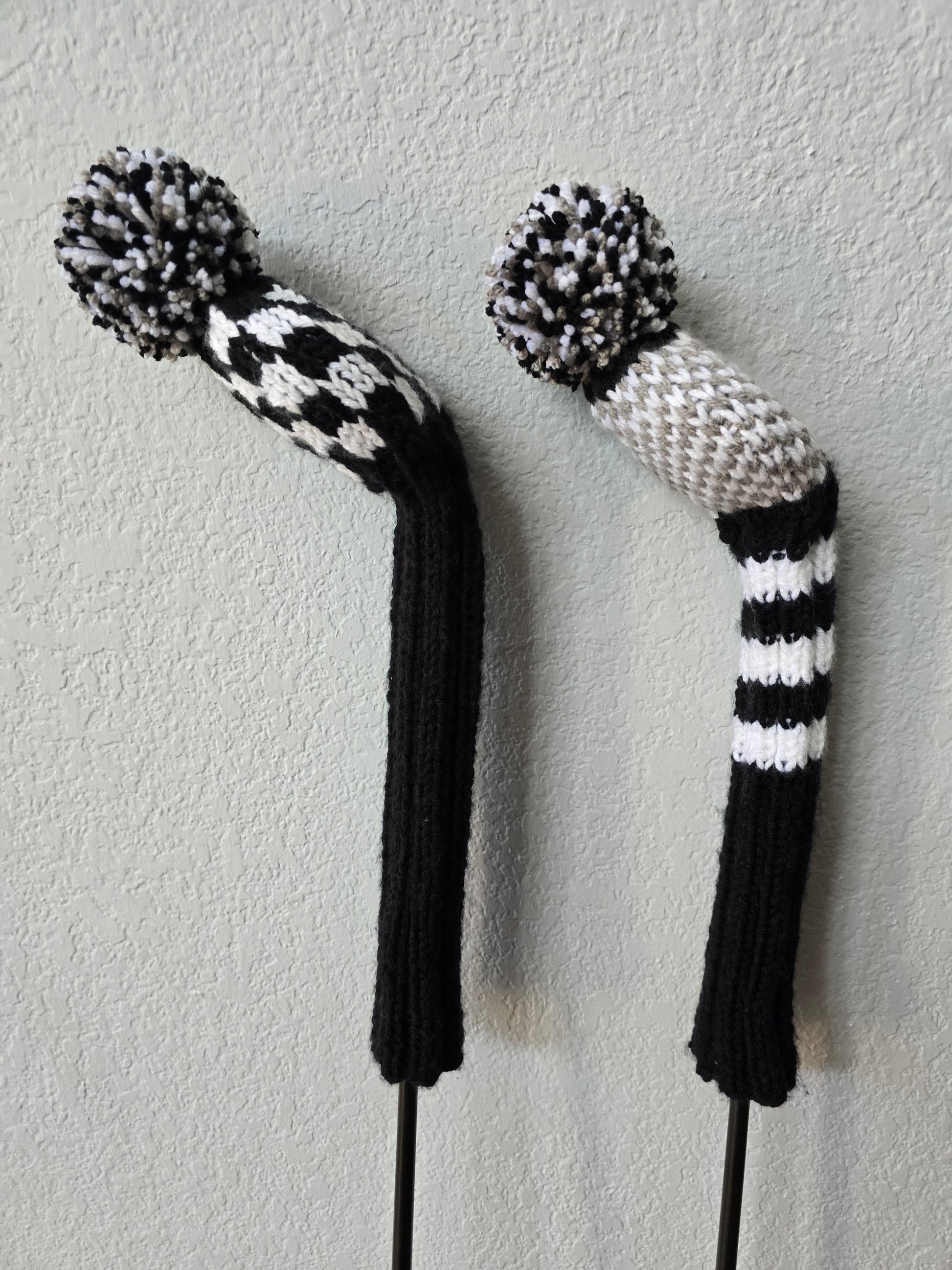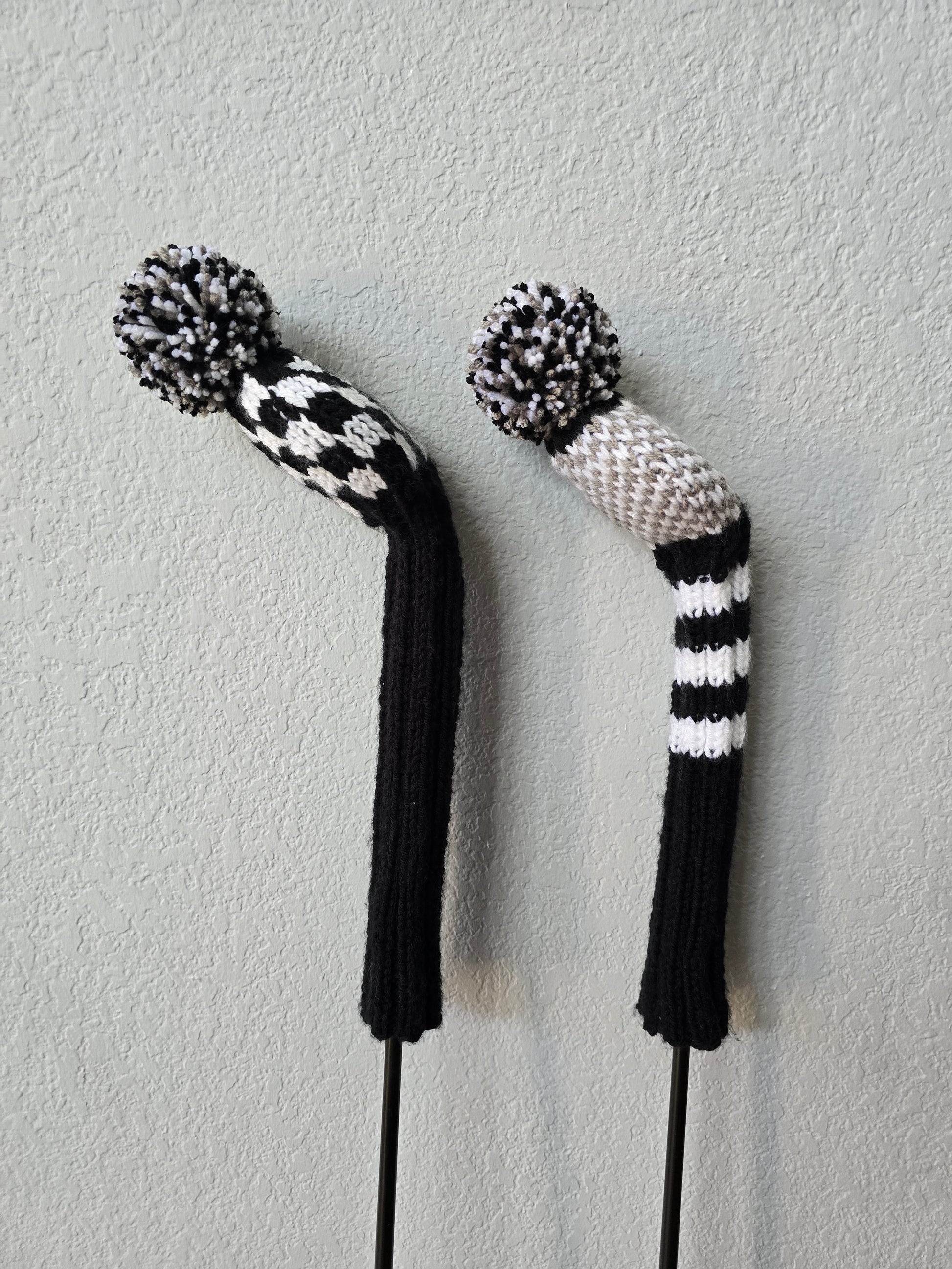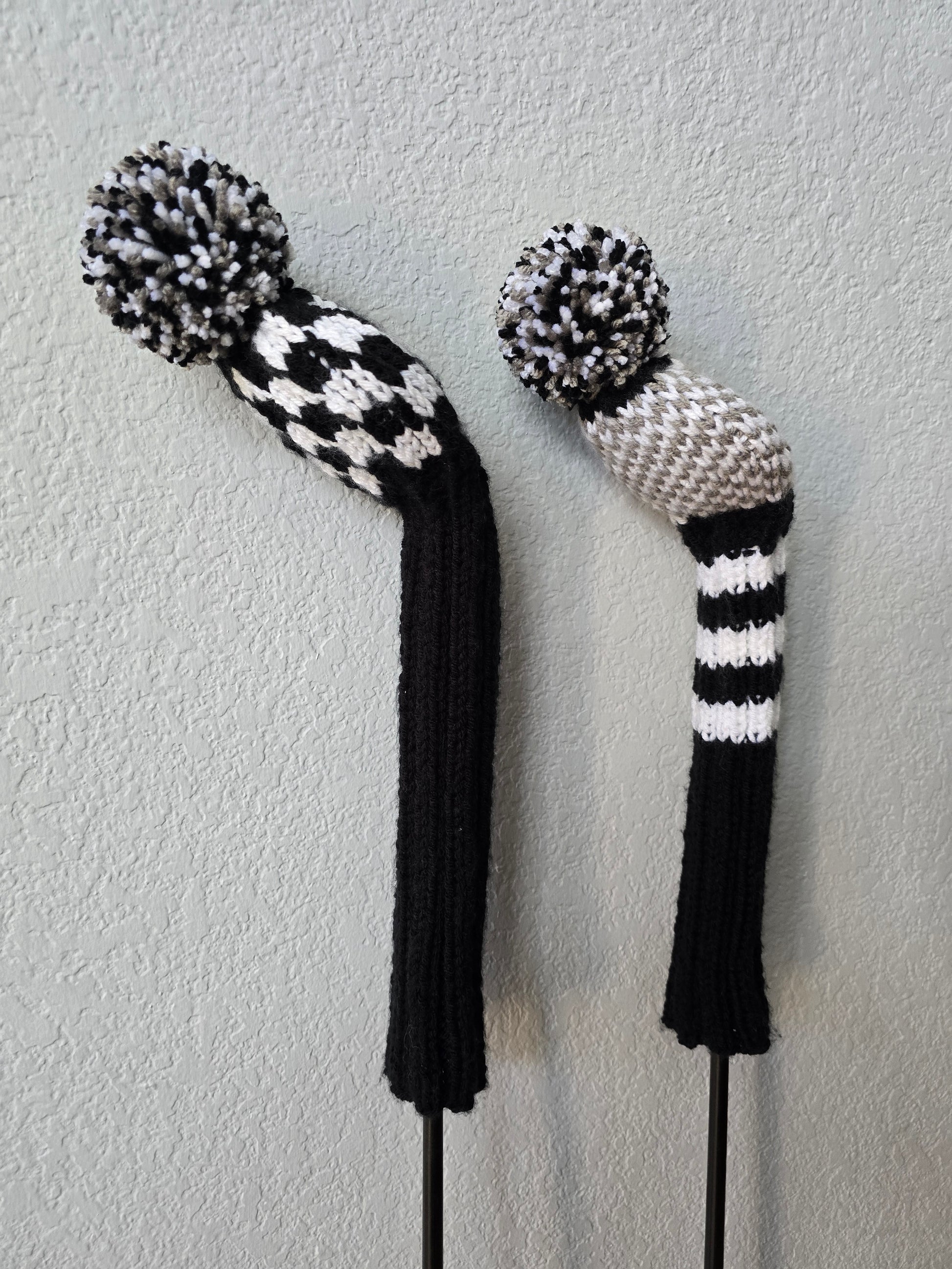 Golf Club Covers Hand Knit Black & White with Pom Poms for Fairway Woods