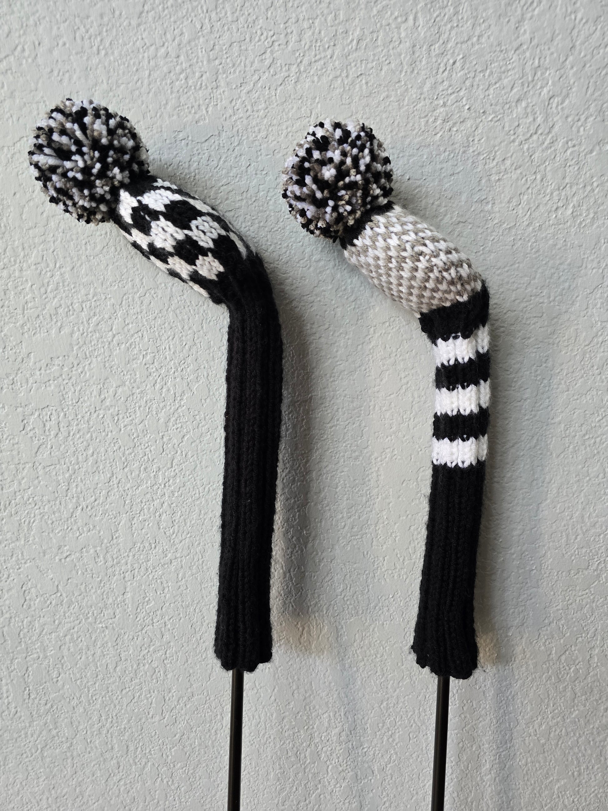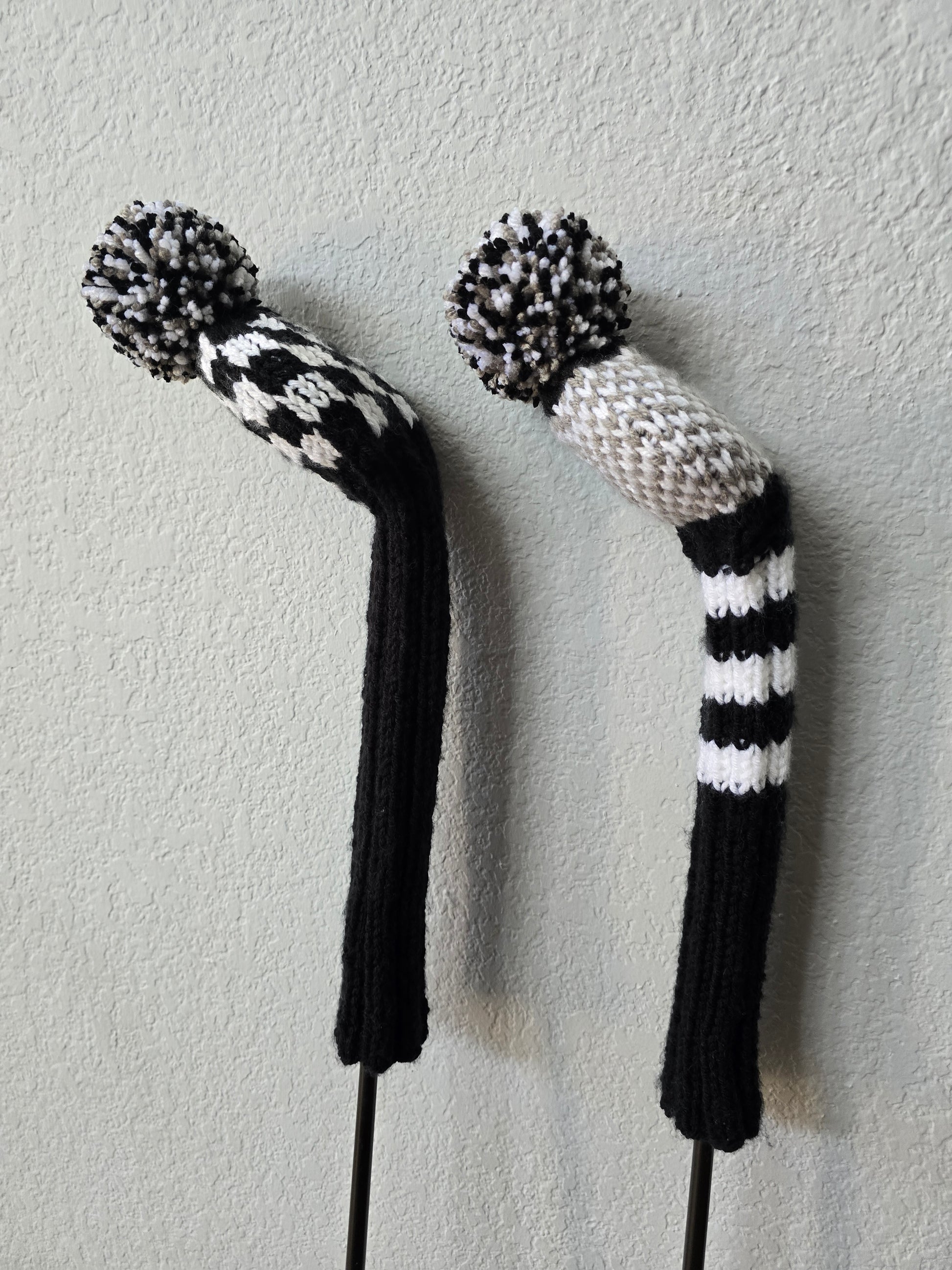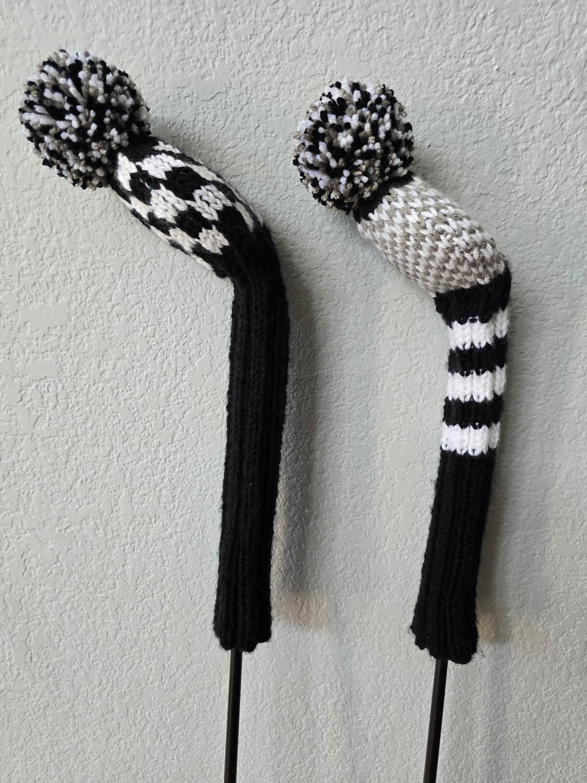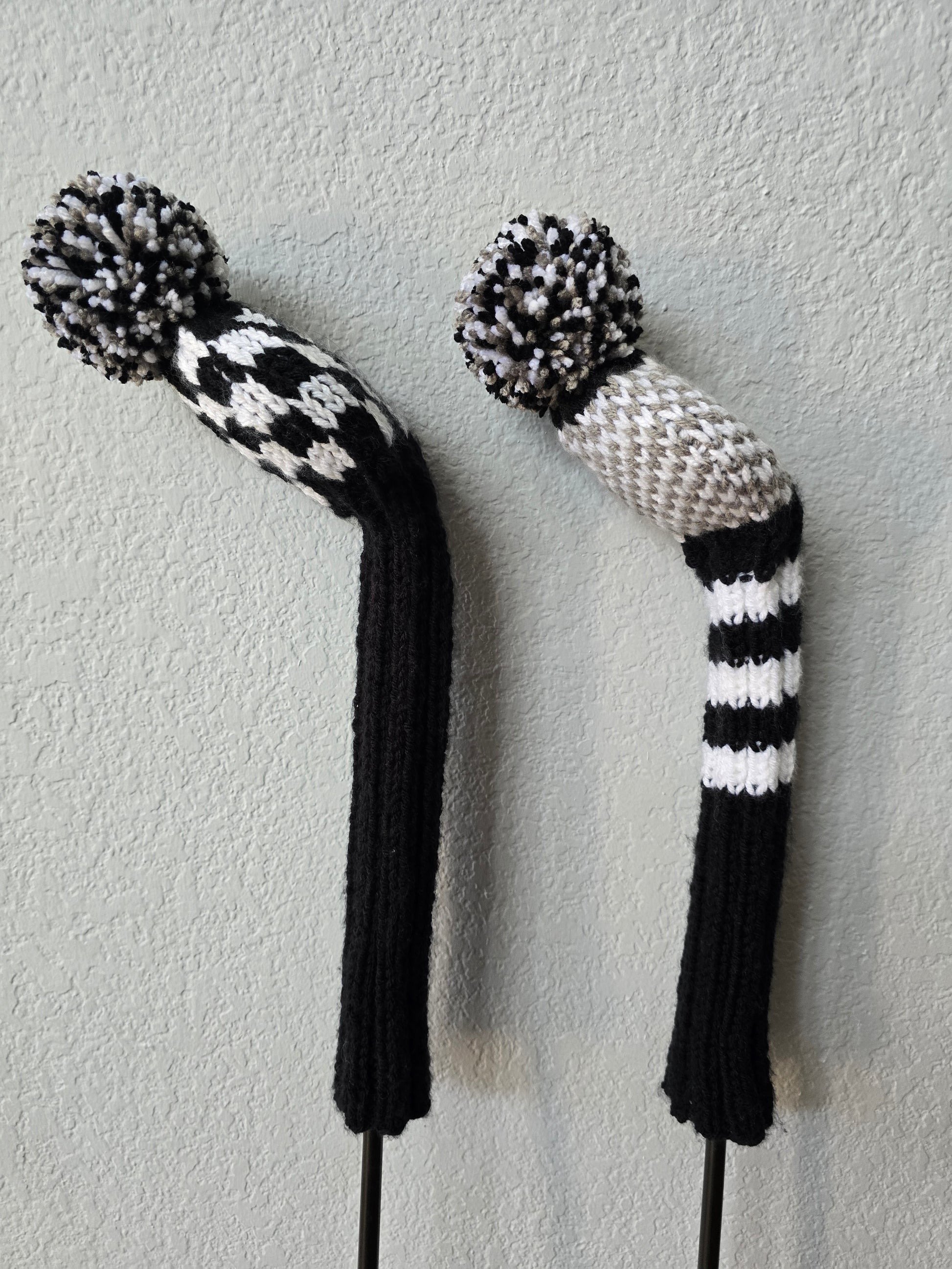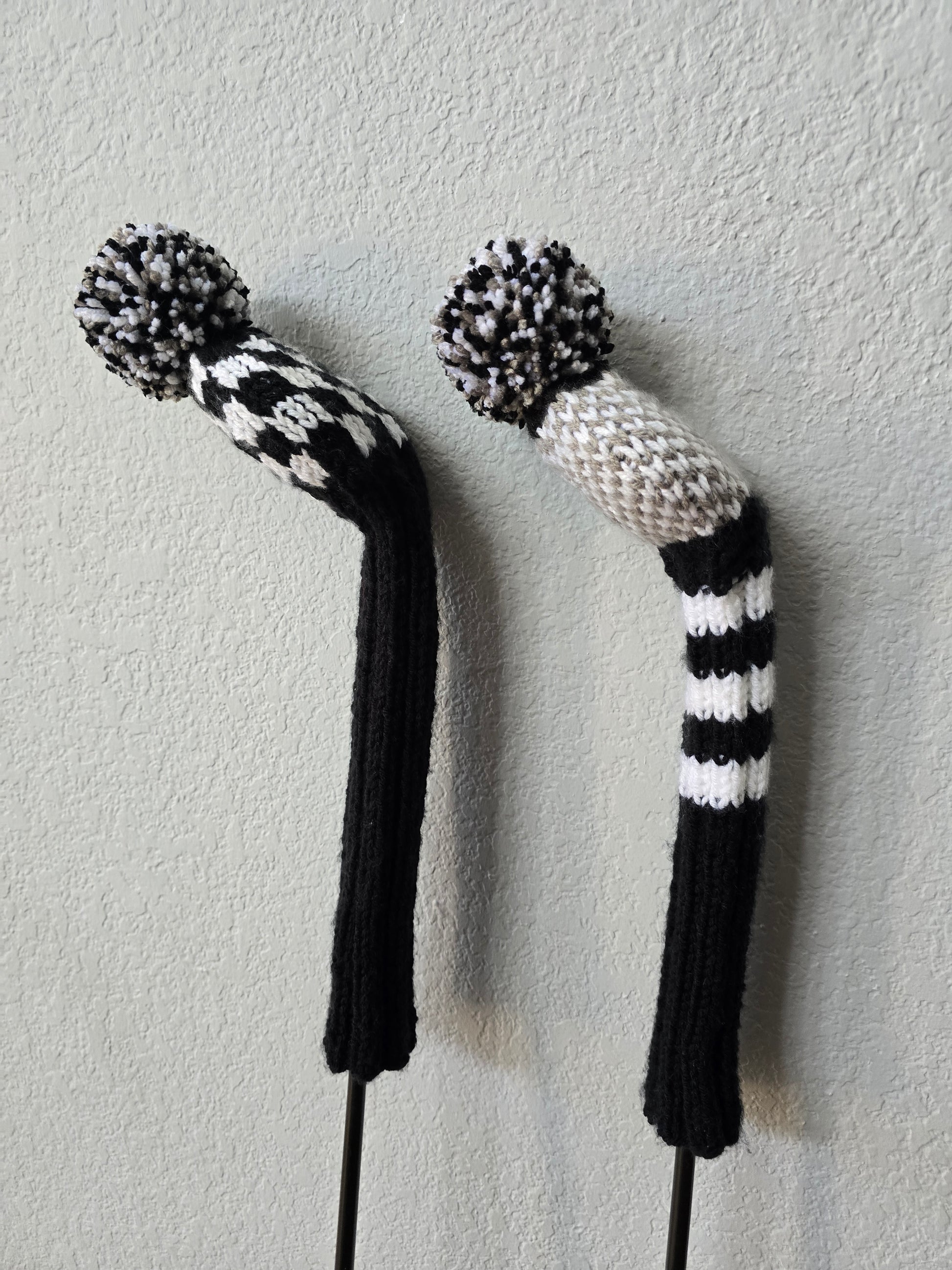 Golf Club Covers Hand Knit Black & White with Pom Poms for Fairway Woods
