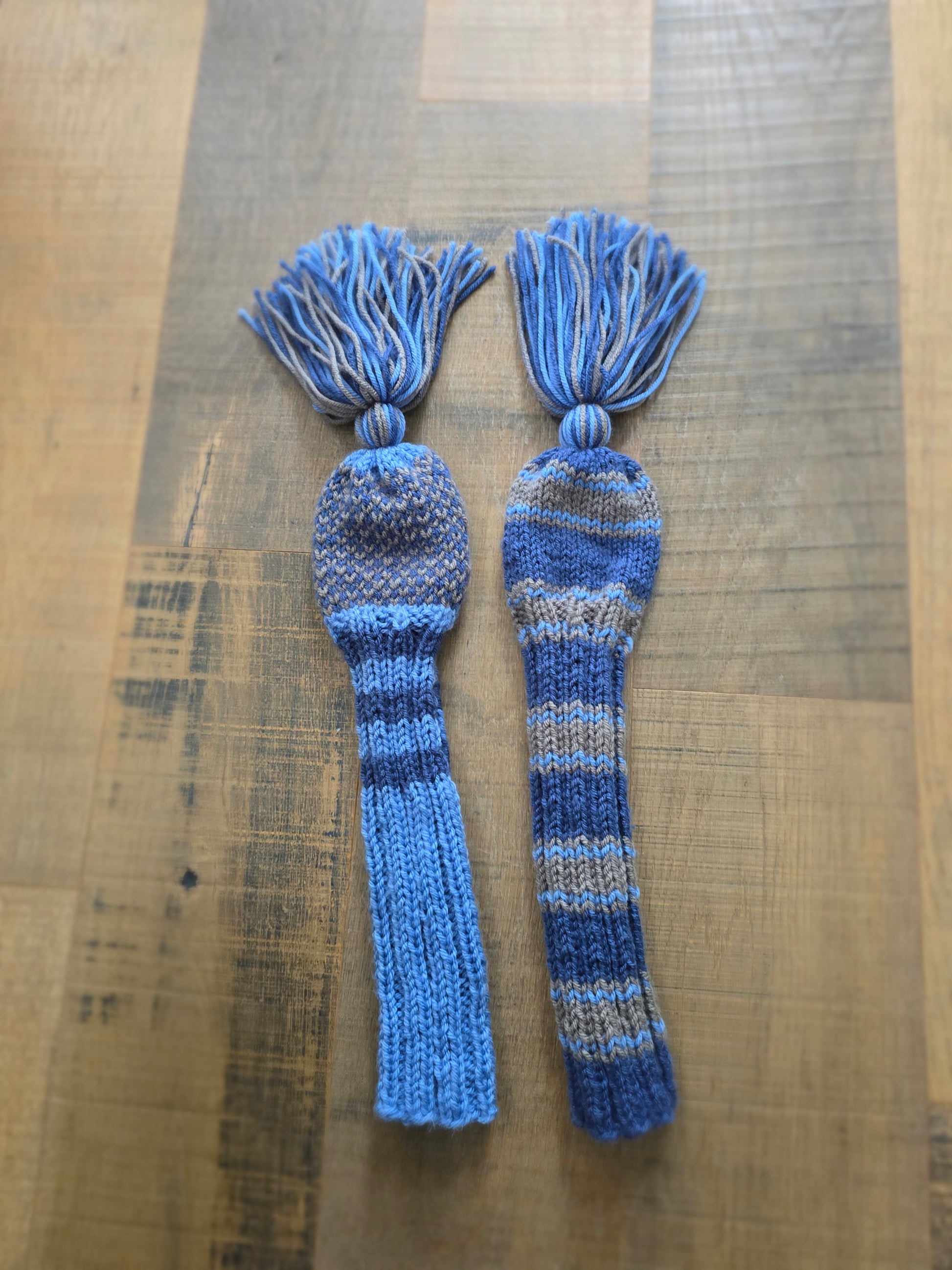 Hand Knit Golf Club Head Covers Retro-Vintage Black, Blue & Gray with Tassels for Fairway Woods