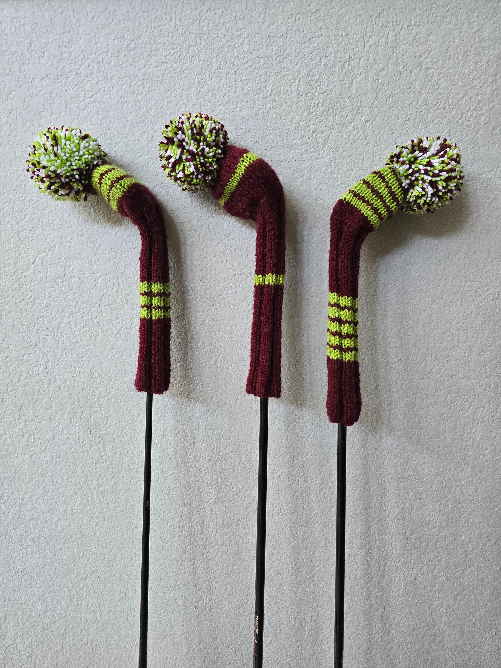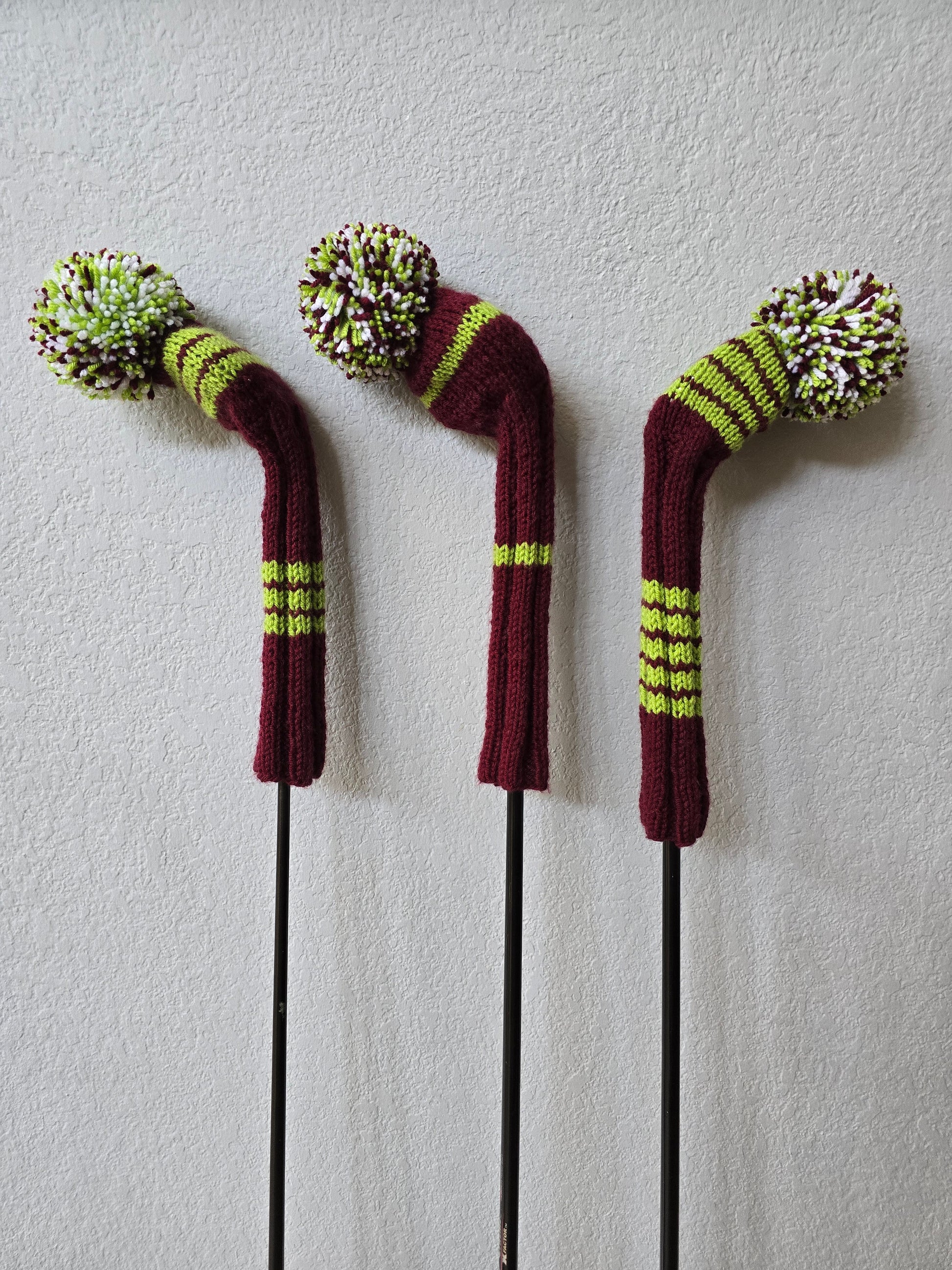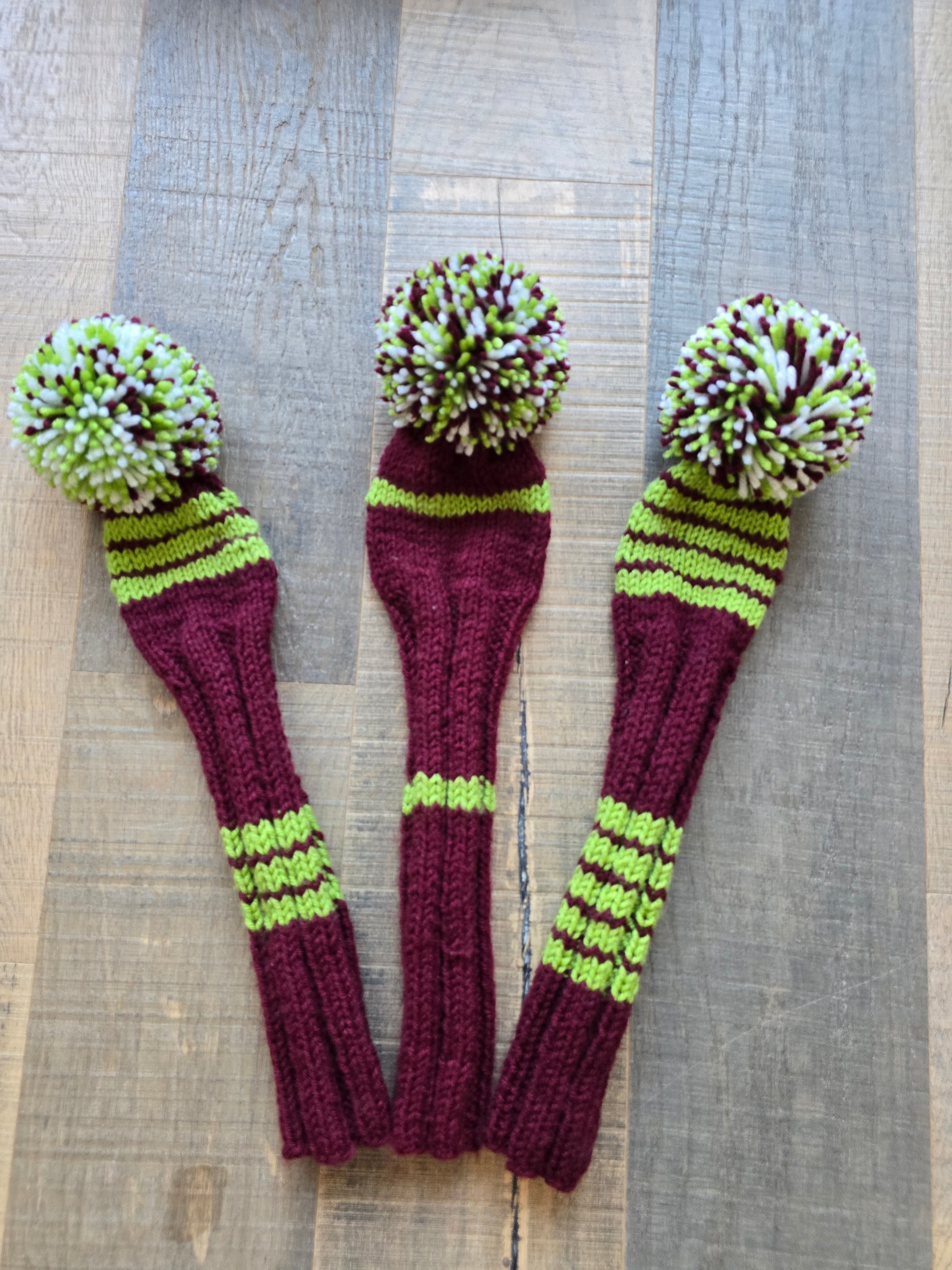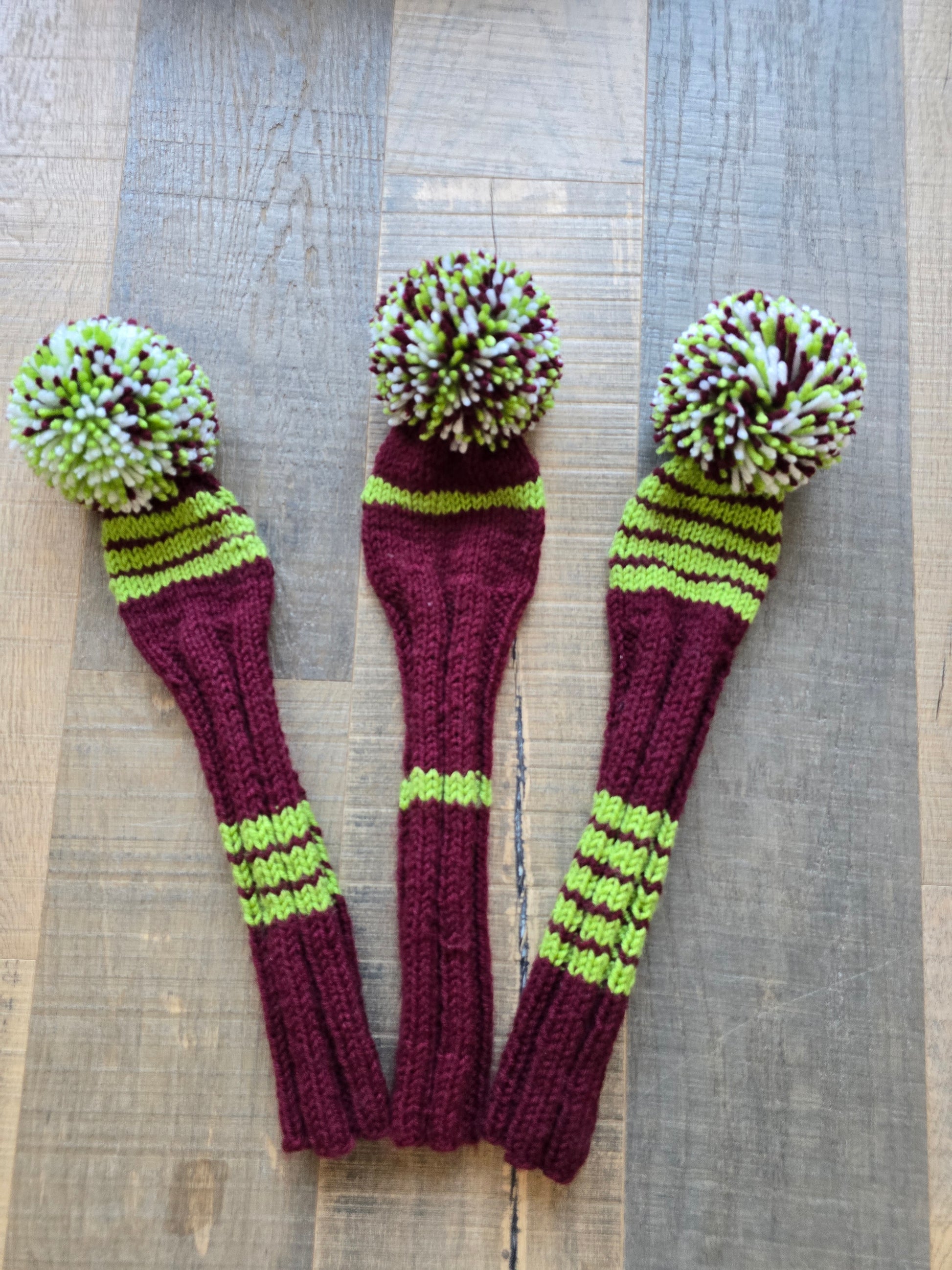 Three Hand Knit Golf Club Head Covers Retro-Vintage Burgundy, Green & White with Pom Poms for Drivers, Woods