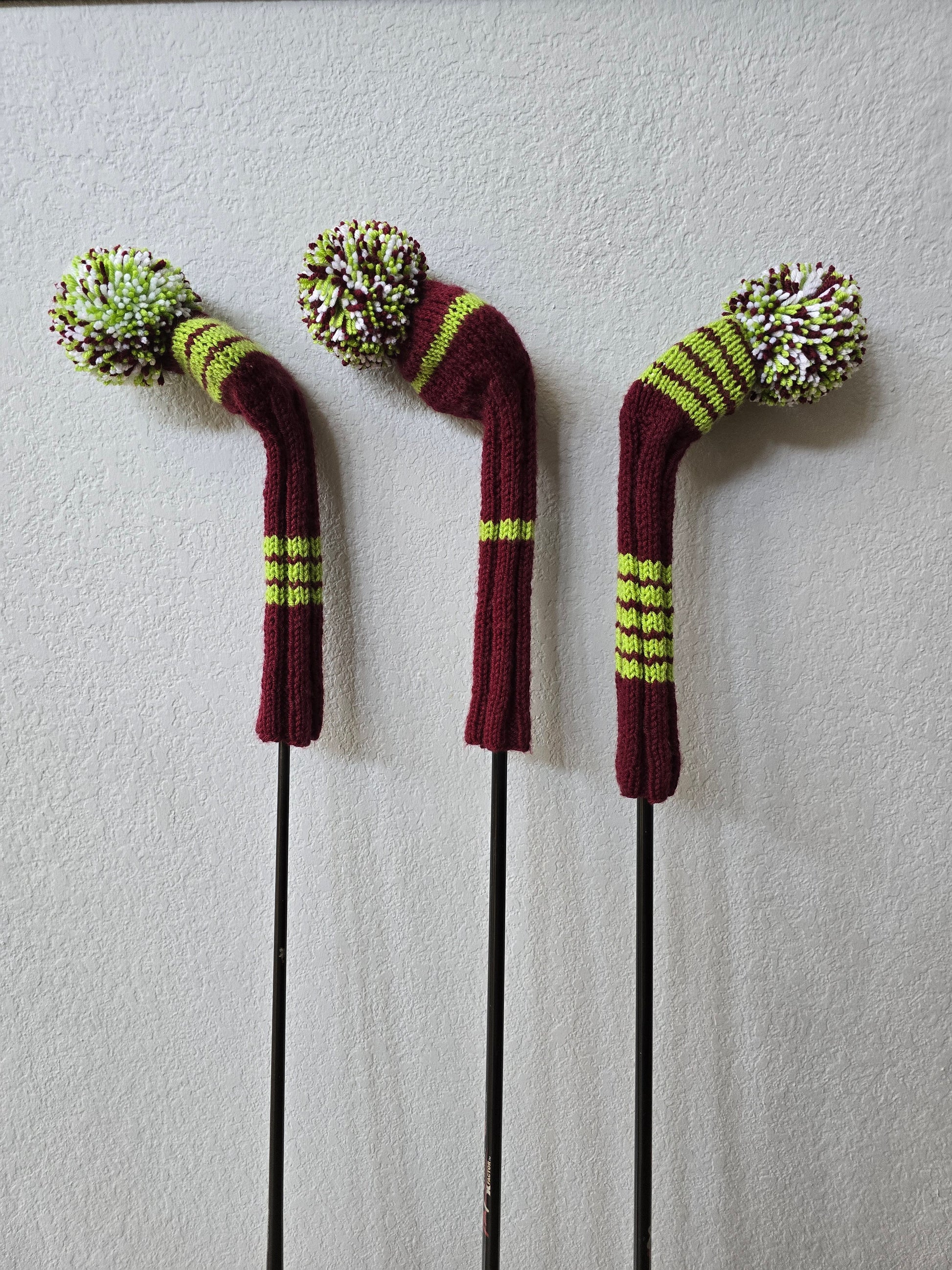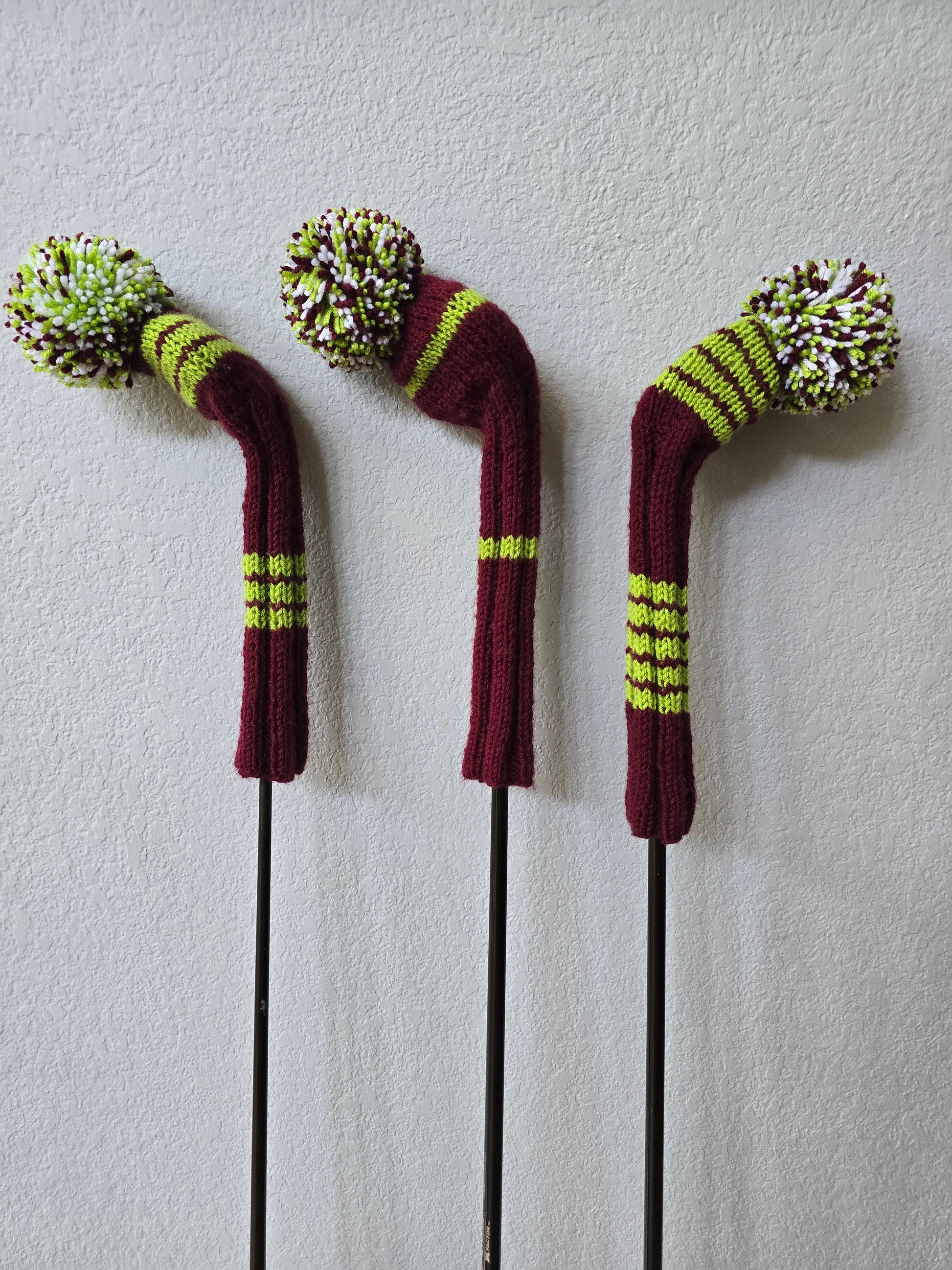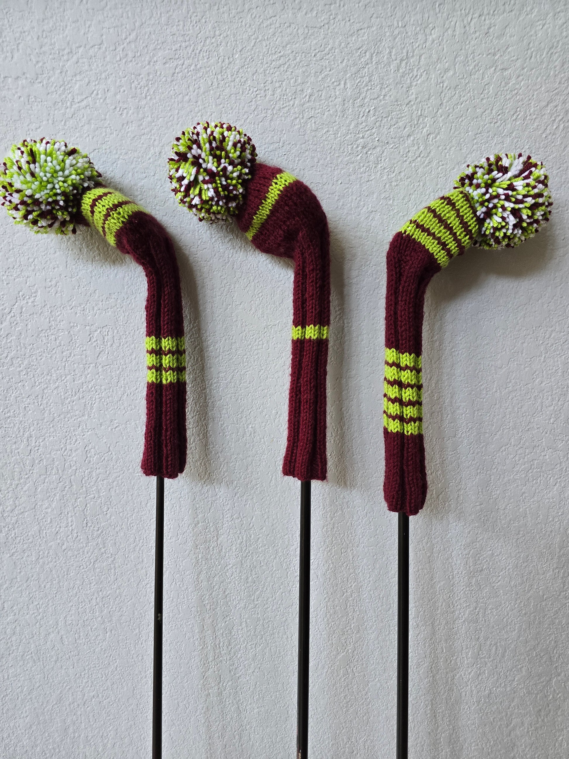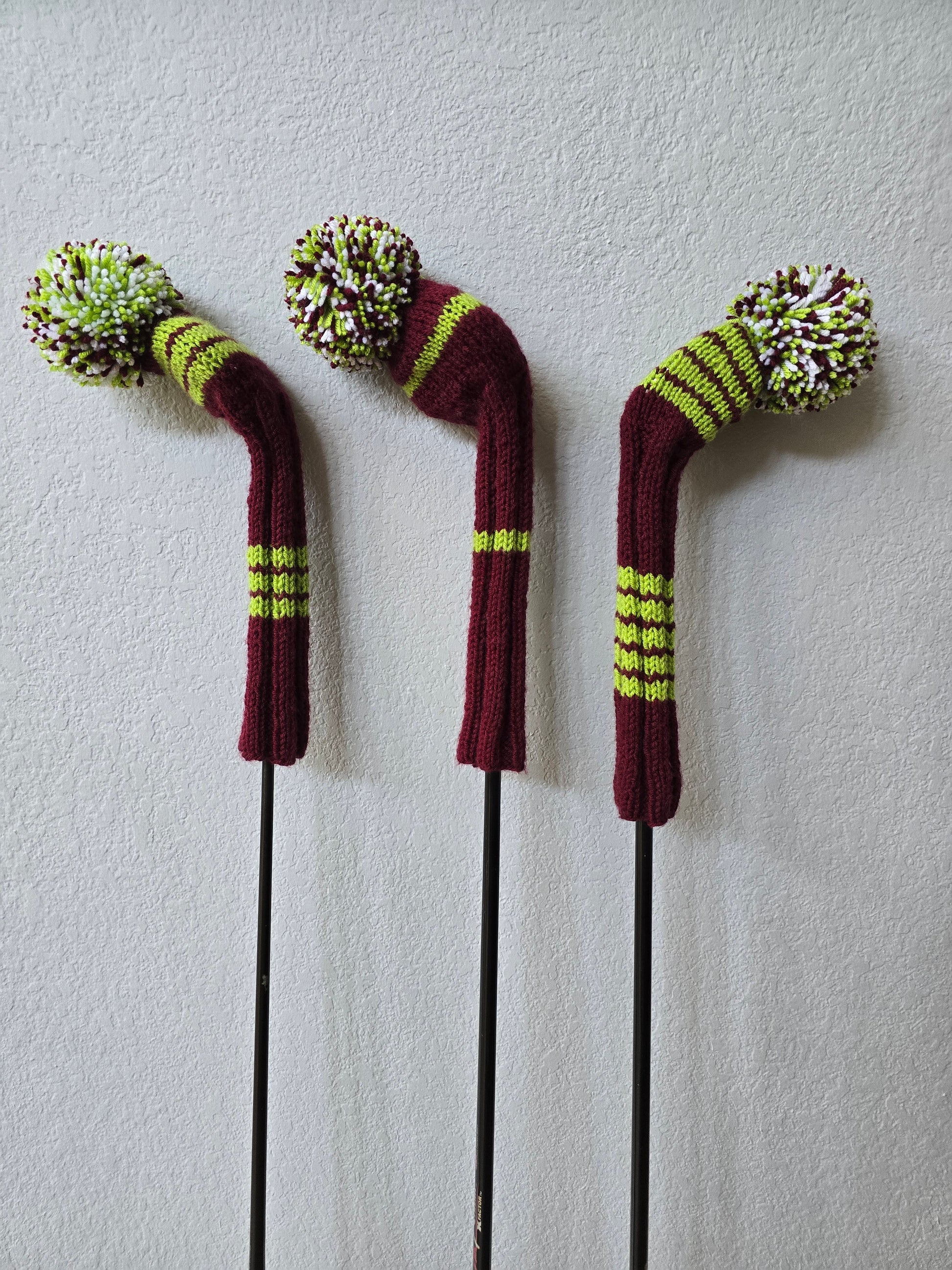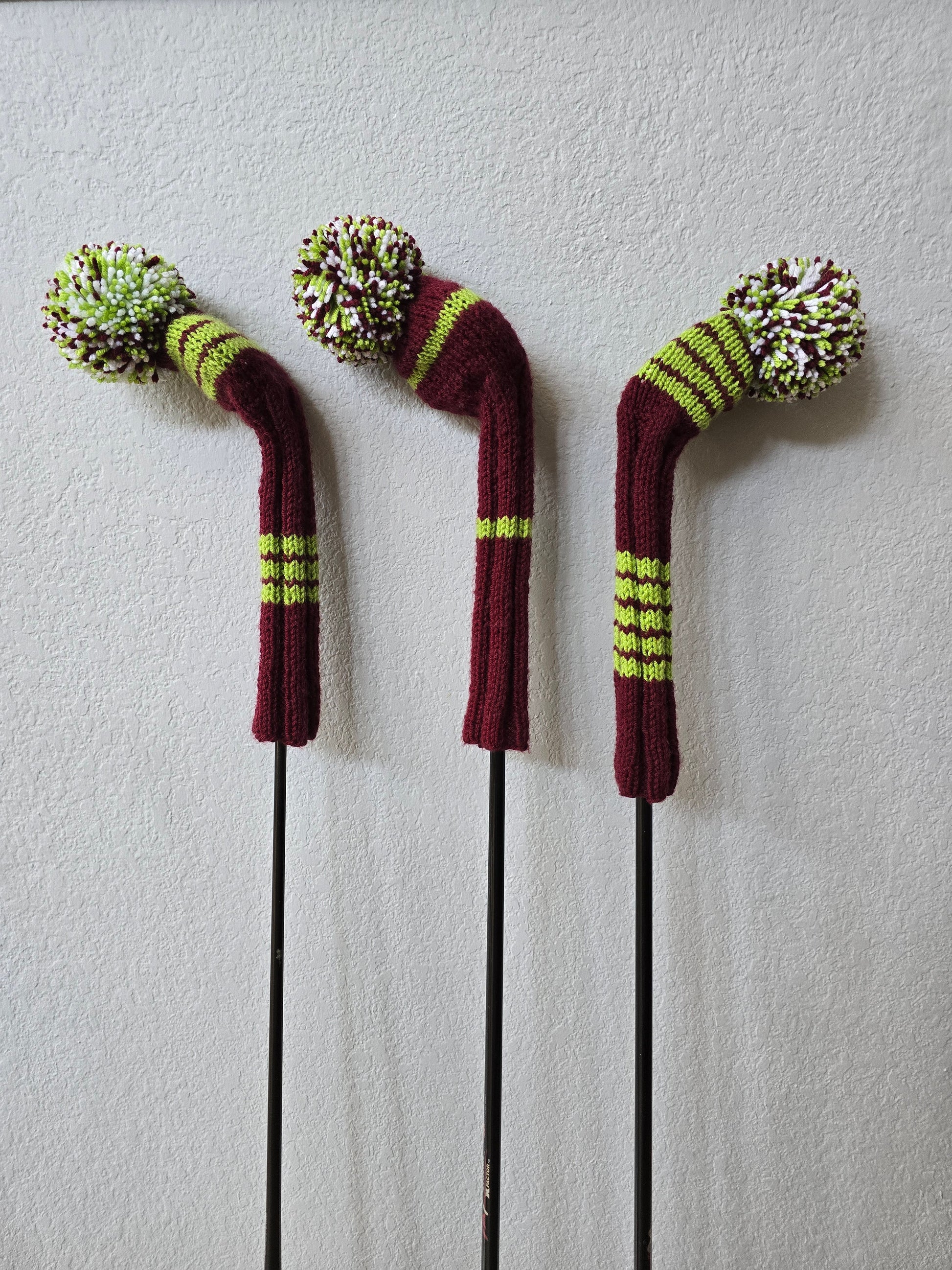 Three Hand Knit Golf Club Head Covers Retro-Vintage Burgundy, Green & White with Pom Poms for Drivers, Woods