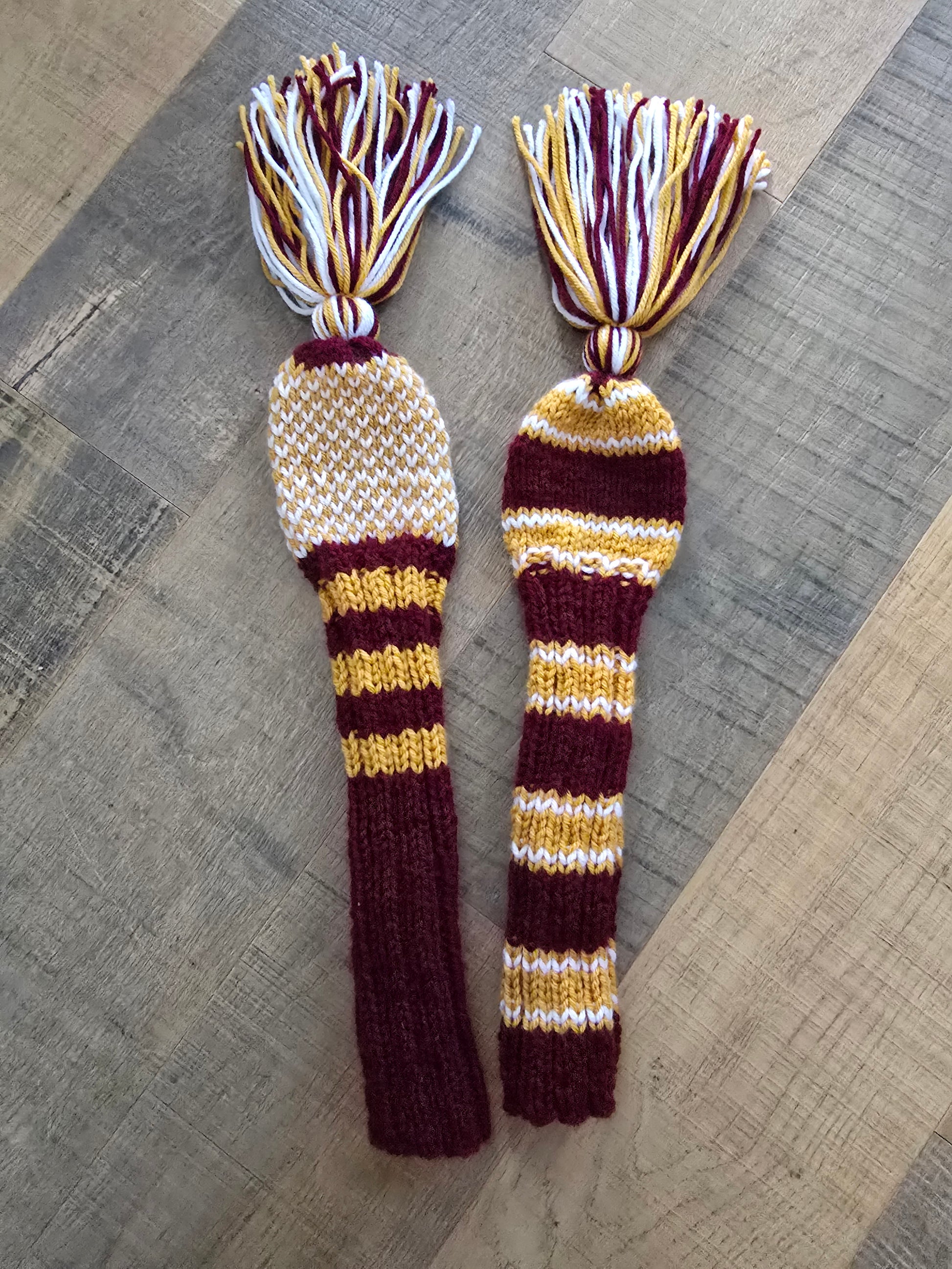 Enhance your golf bag with these Two Golf Club Head Covers in Retro-Vintage Burgundy, Gold & White. Designed specifically for fairway woods, this set of 2 hand-knit covers features coordinating tassels and measures 14 inches for optimal club protection. Customize your covers with your favorite team's colors or match your bag's design. Contact us for any inquiries. Thank you for your interest!