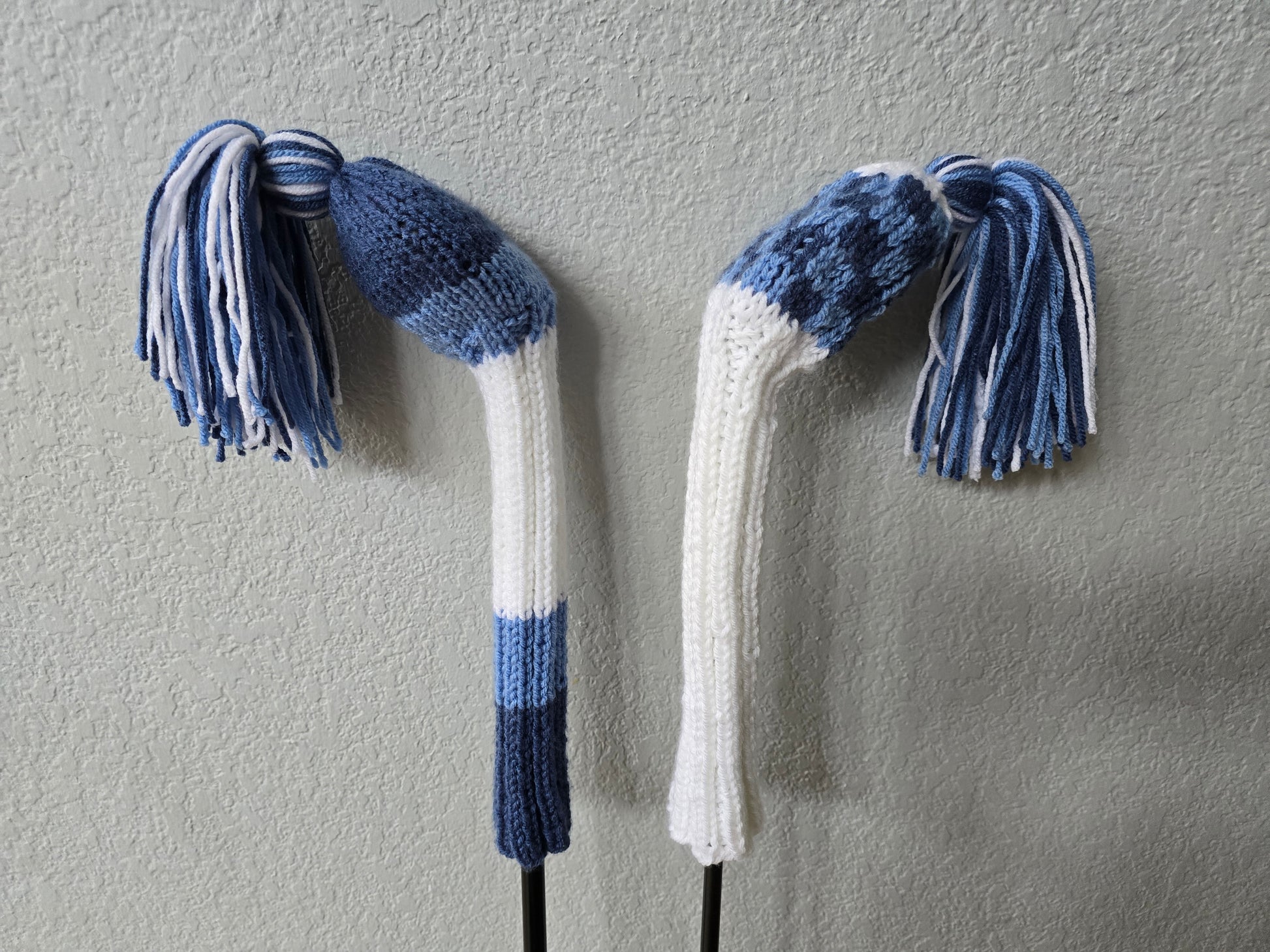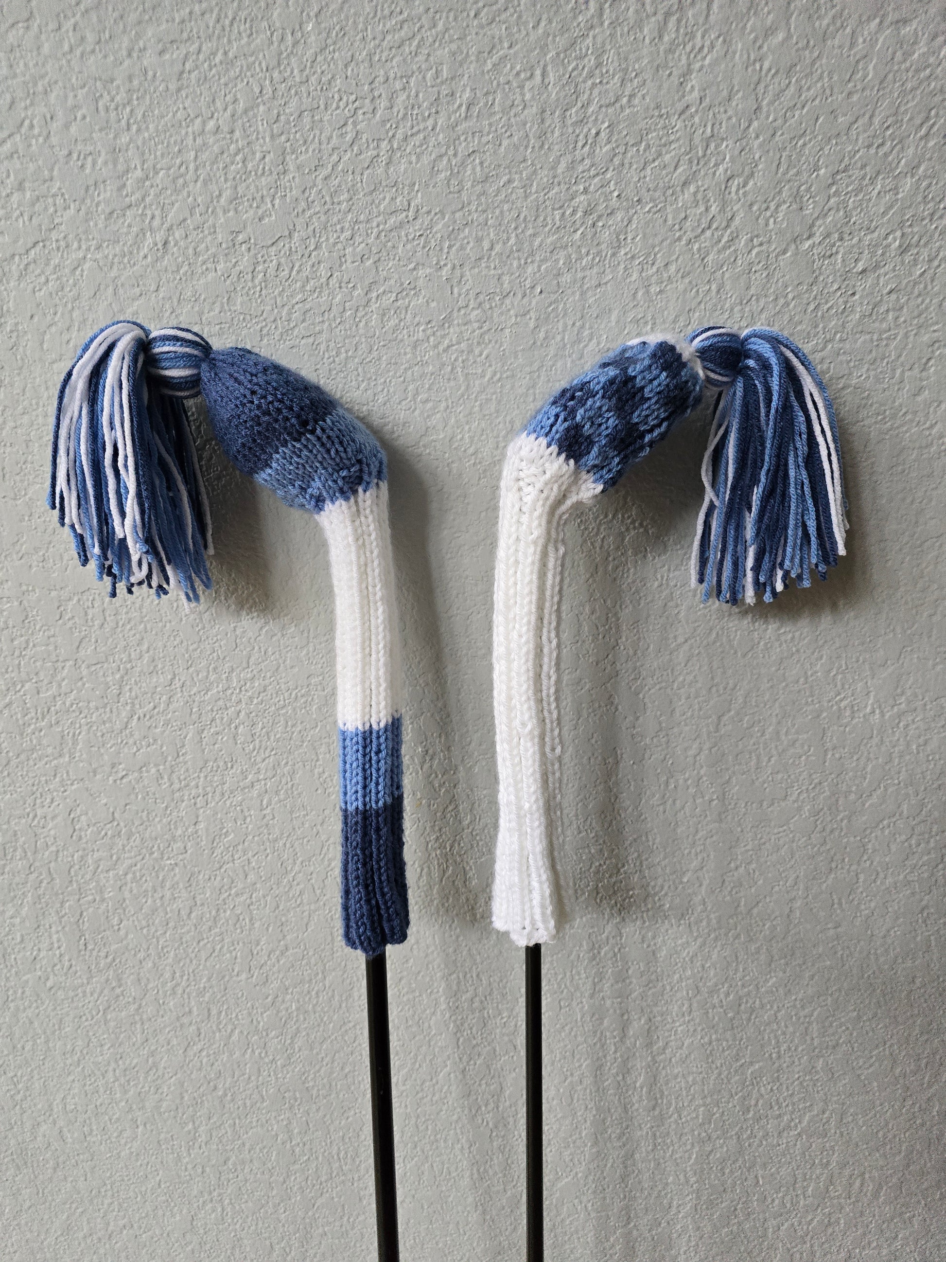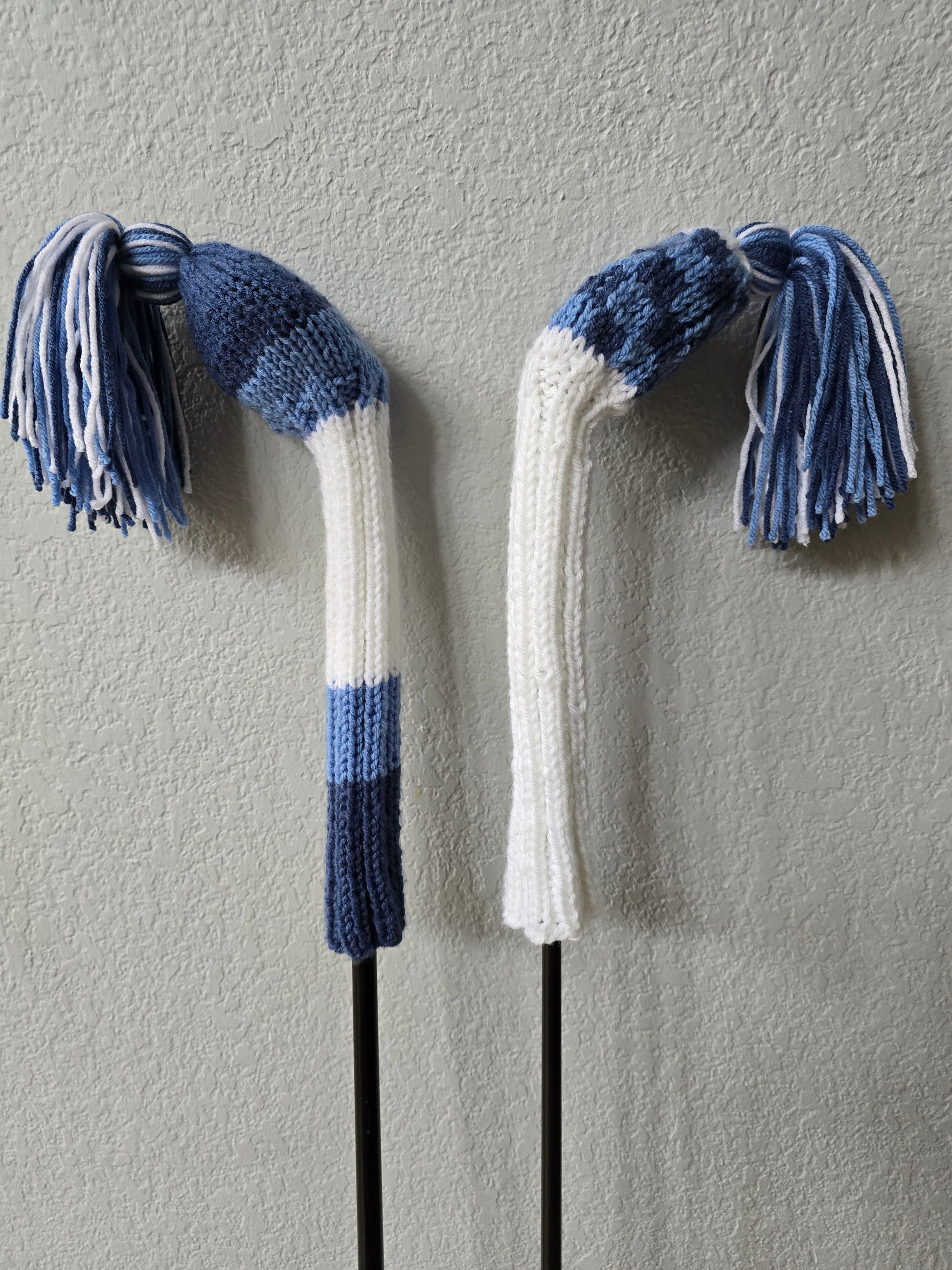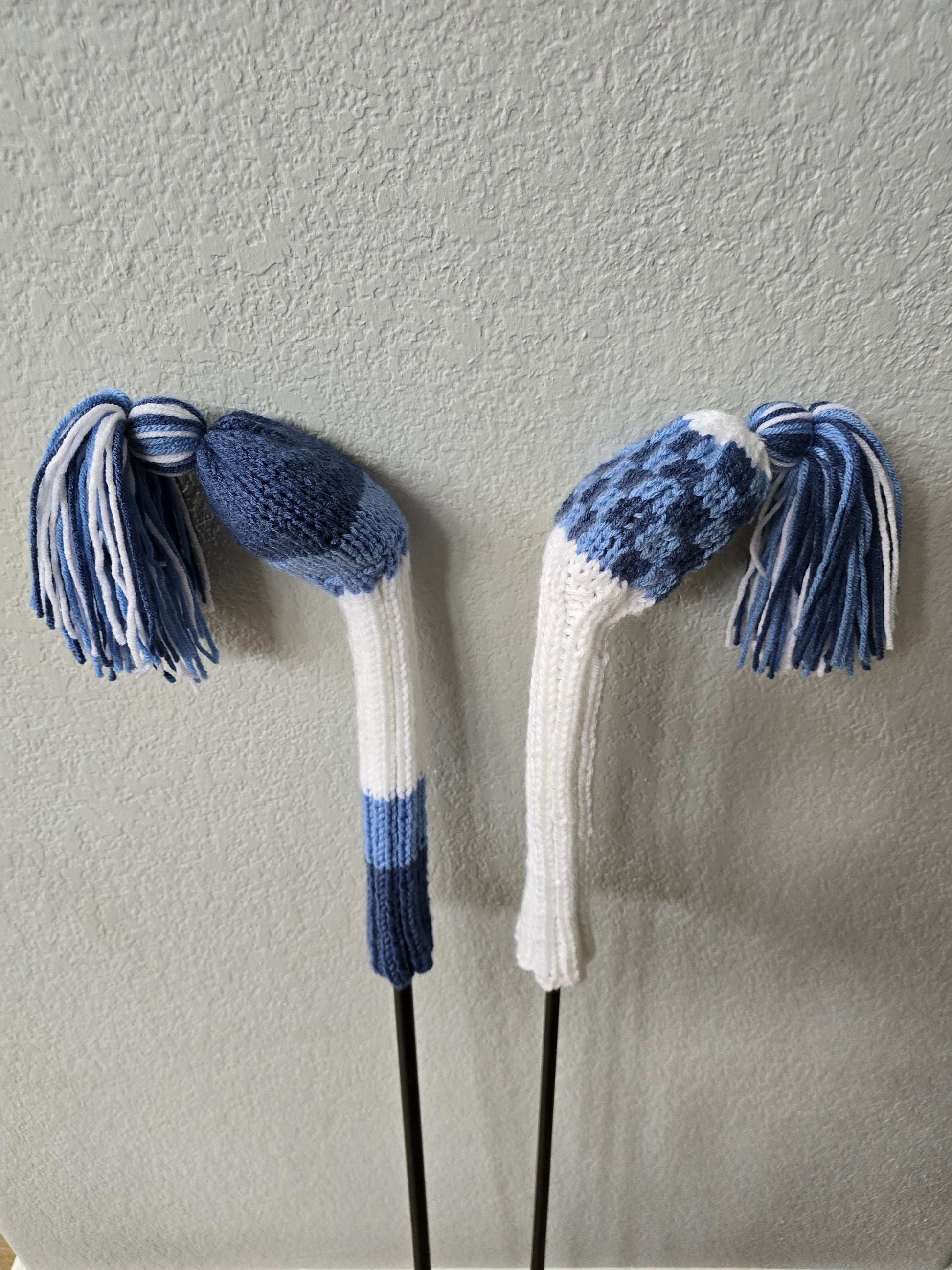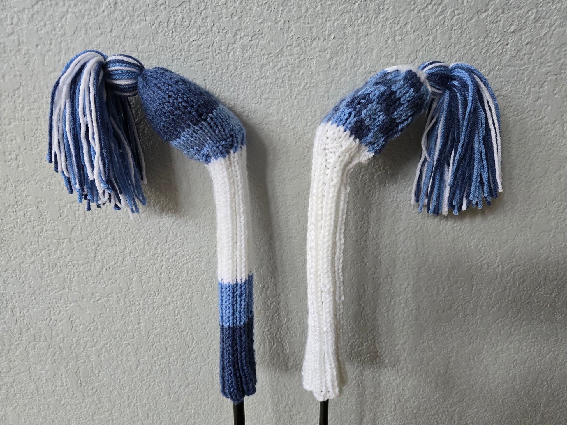 Enhance your golf bag with these Two Golf Club Head Covers in Retro-Vintage Blue & White. Designed specifically for fairway woods, this set of 2 hand-knit covers features coordinating tassels and measures 14 inches for optimal club protection. Customize your covers with your favorite team's colors or match your bag's design. Contact us for any inquiries. Thank you for your interest!