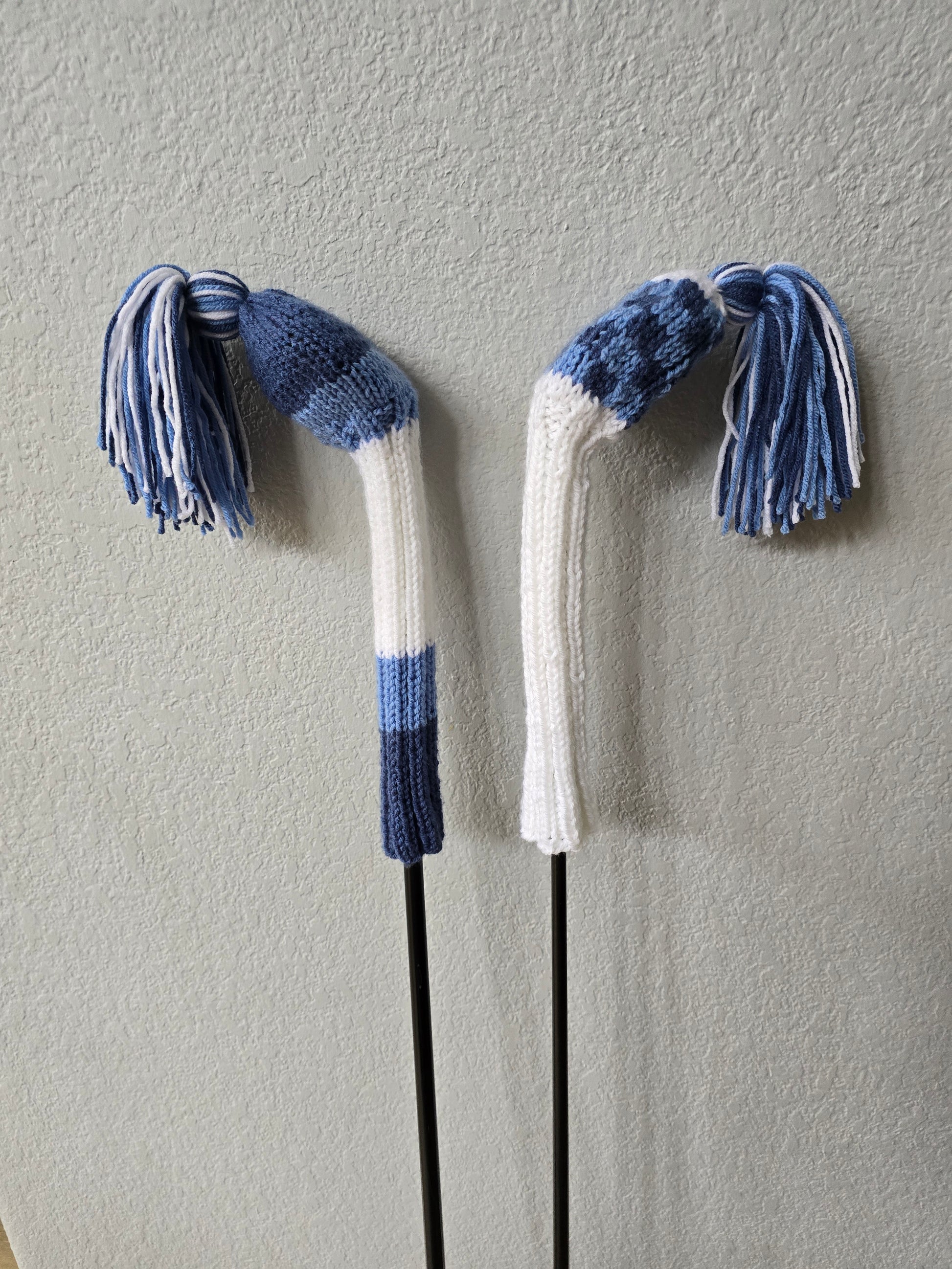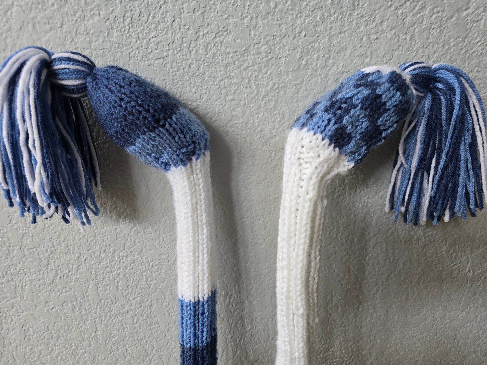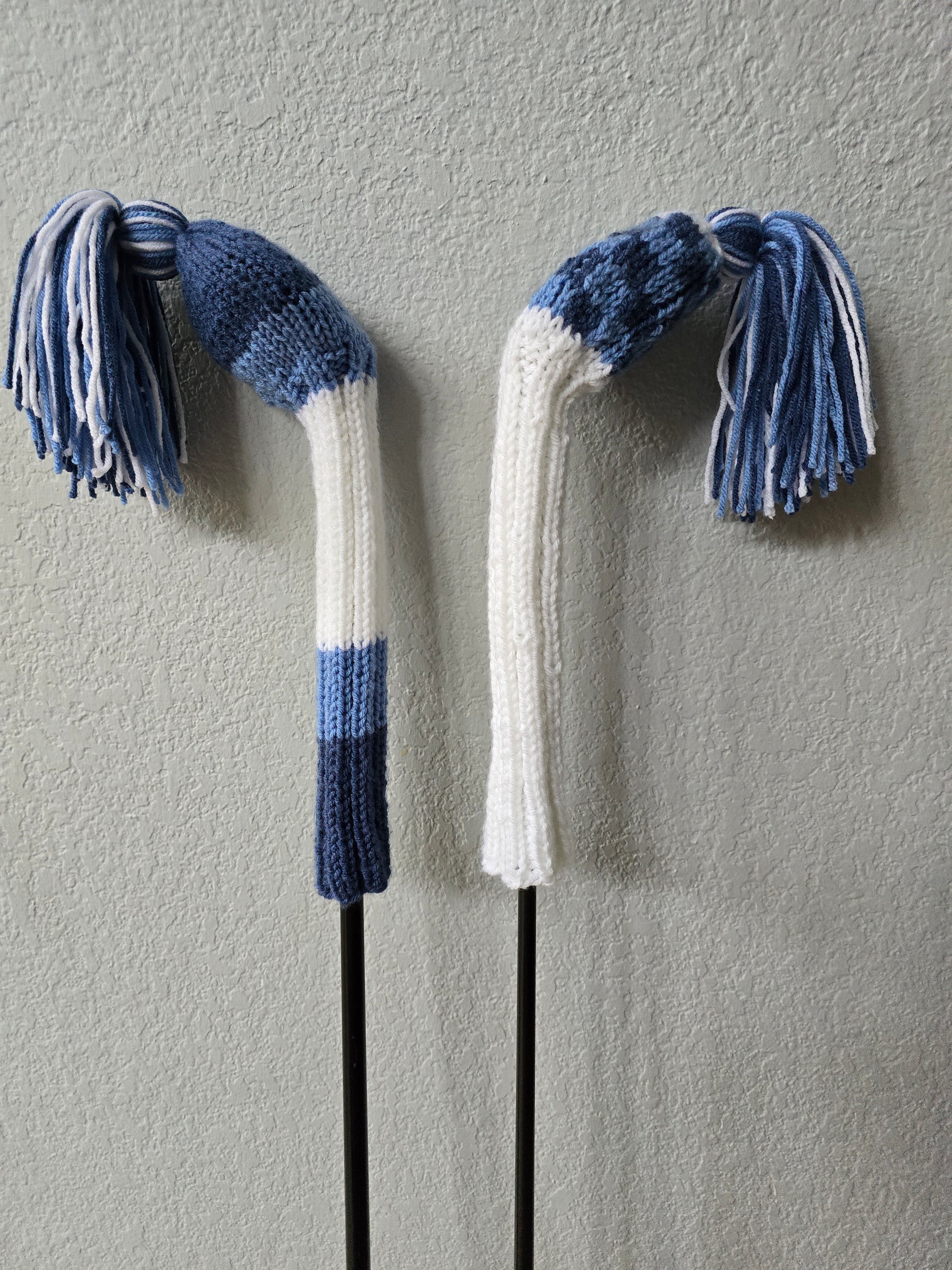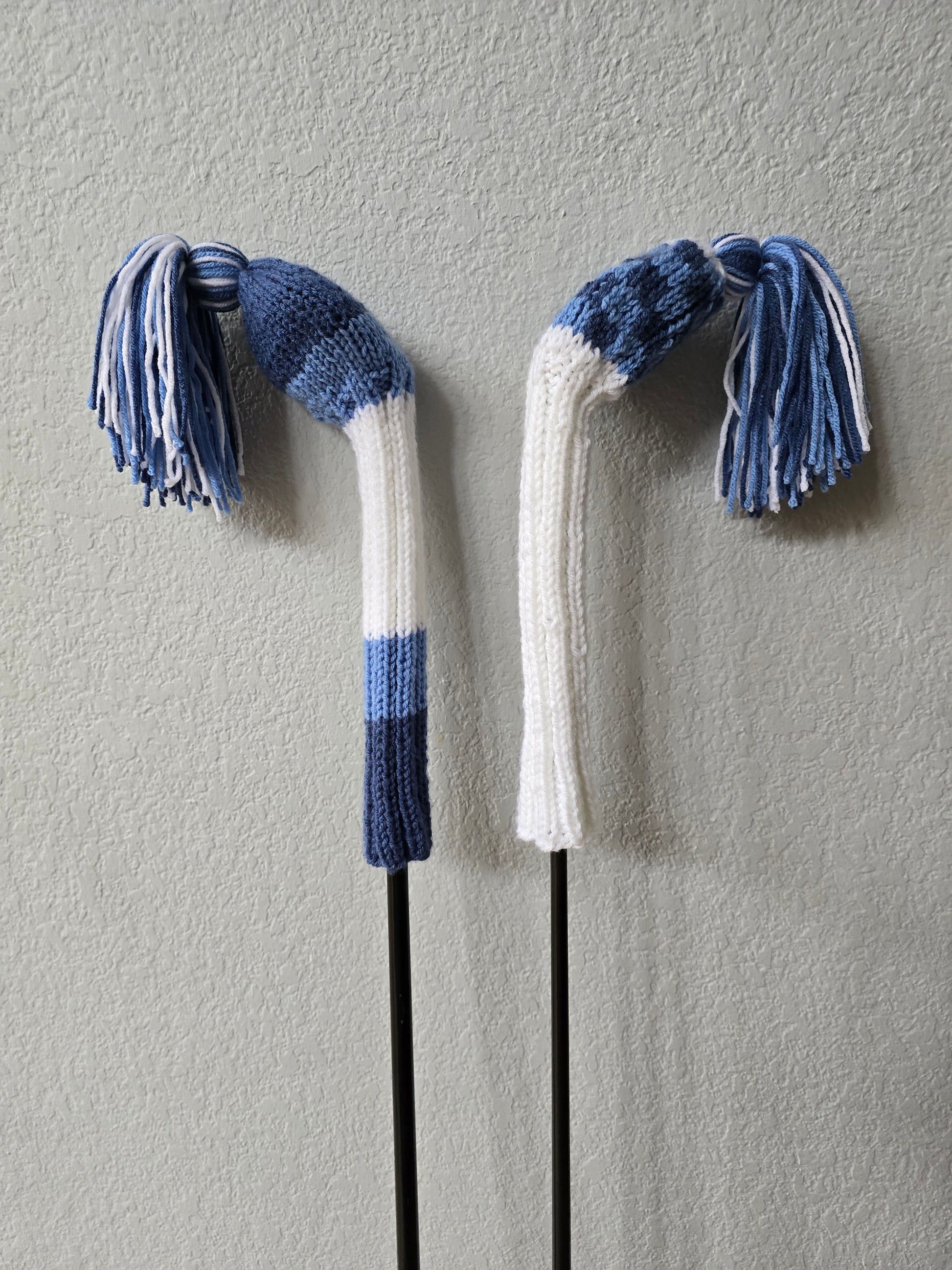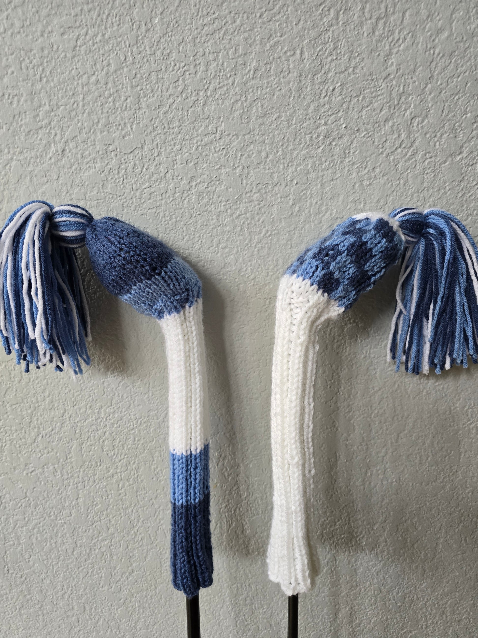 Enhance your golf bag with these Two Golf Club Head Covers in Retro-Vintage Blue & White. Designed specifically for fairway woods, this set of 2 hand-knit covers features coordinating tassels and measures 14 inches for optimal club protection. Customize your covers with your favorite team's colors or match your bag's design. Contact us for any inquiries. Thank you for your interest!