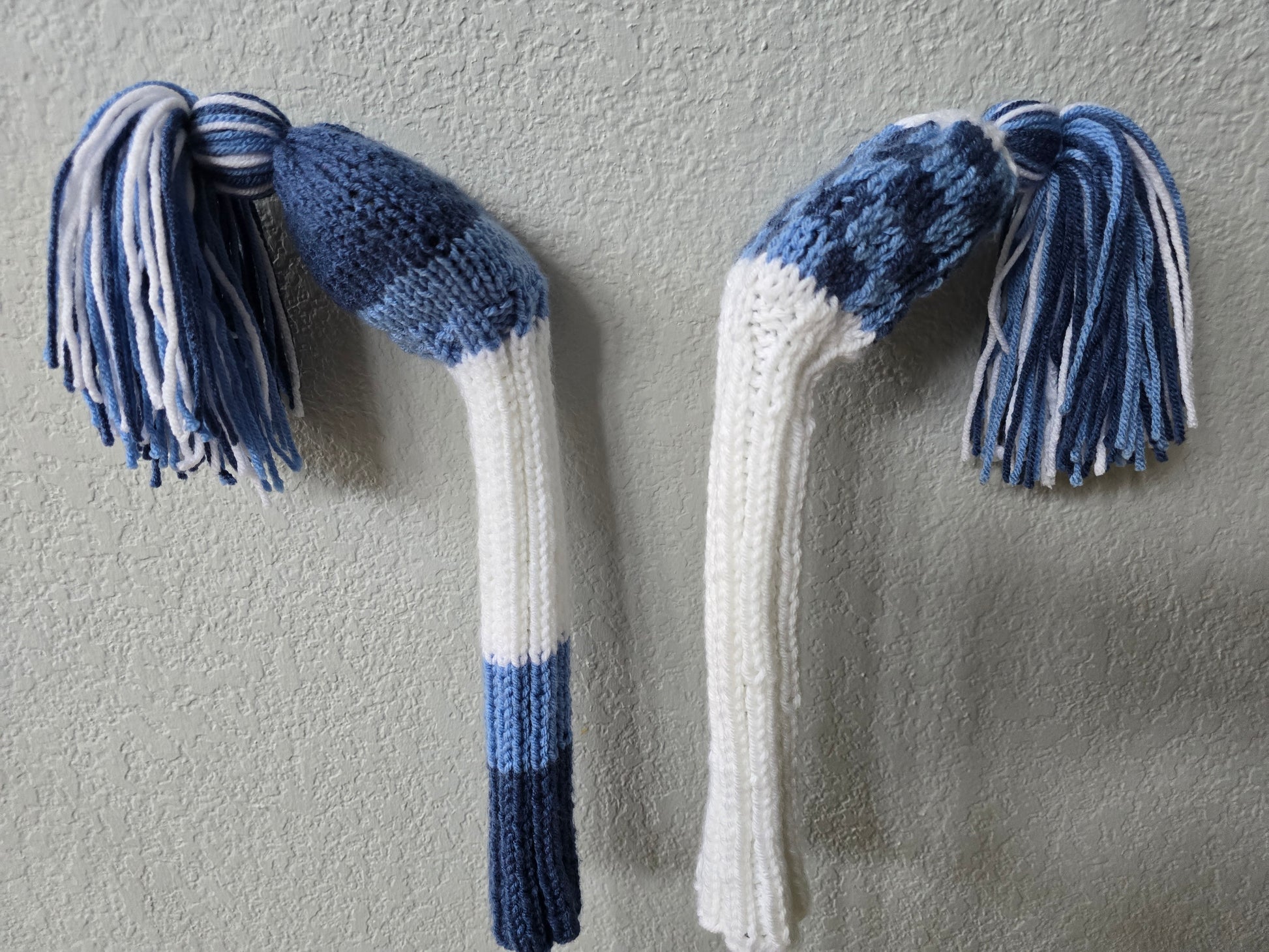 Two Golf Club Head Covers Retro-Vintage Blue & White with Tassels for Fairway Woods