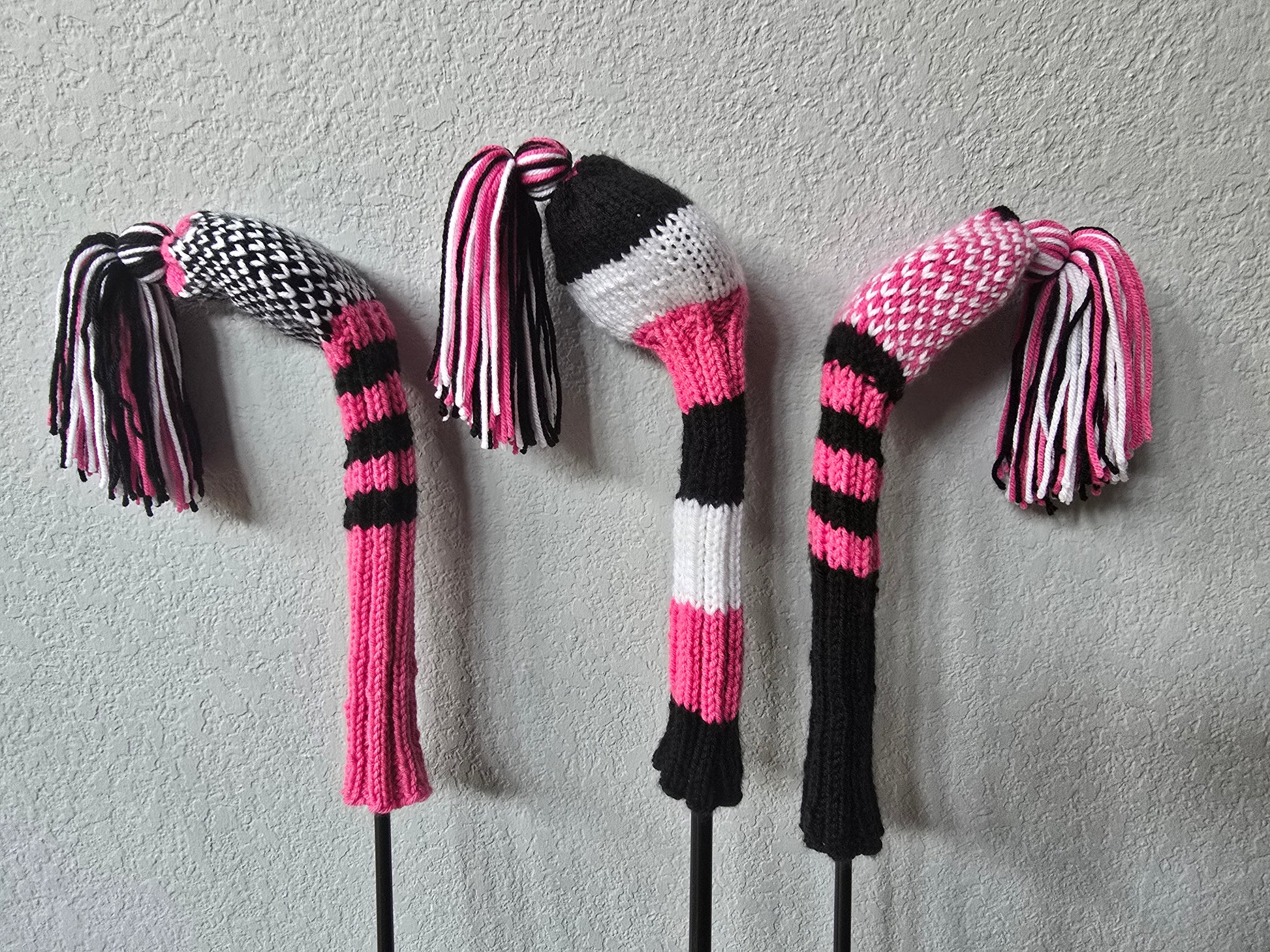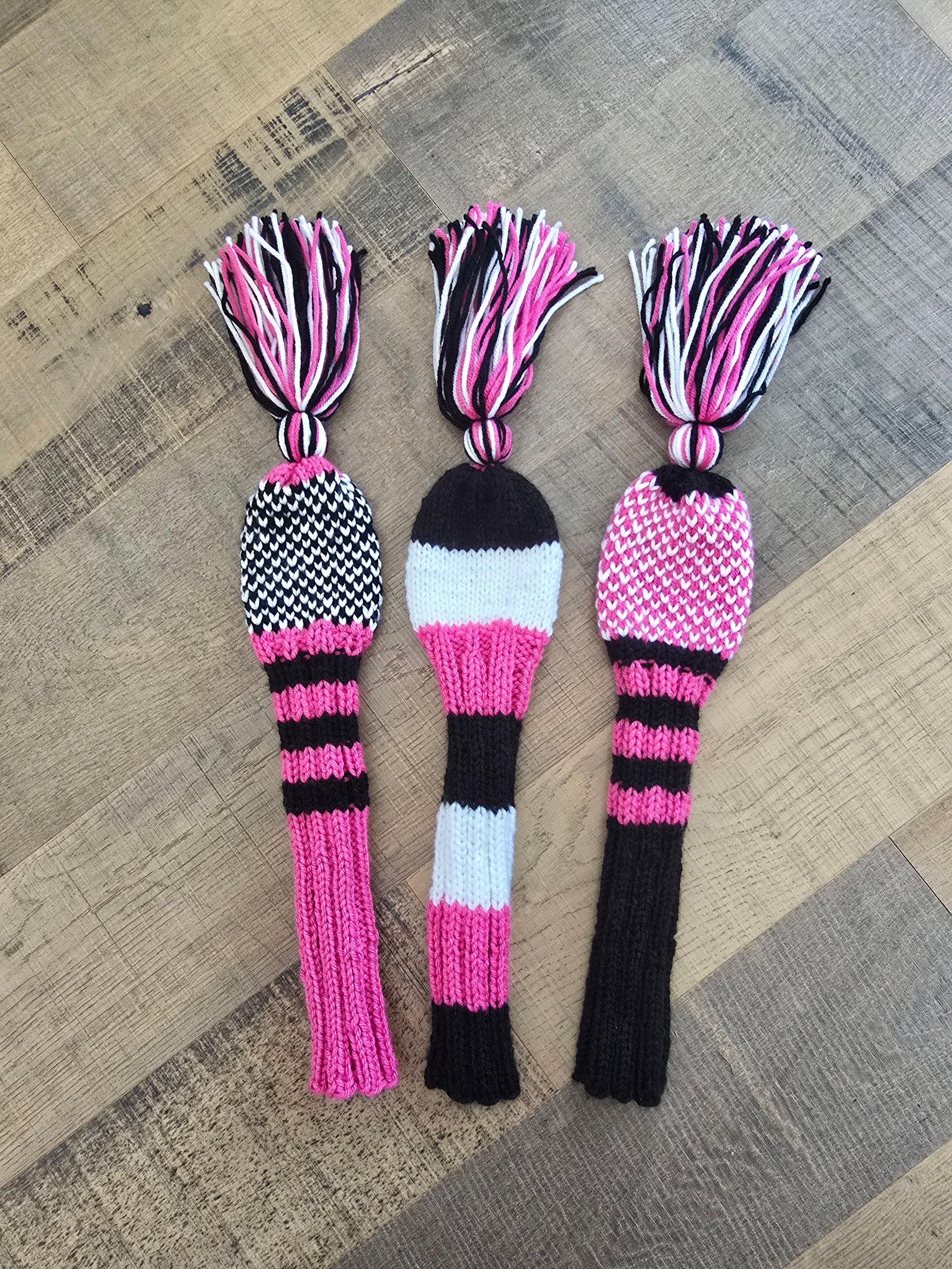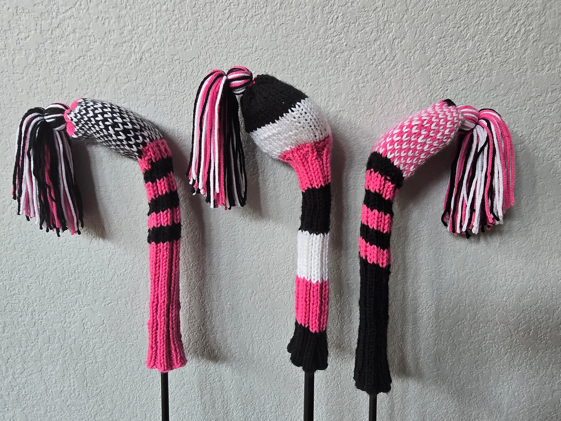 Two Hand Knit Golf Club Head Covers Retro-Vintage Black, Pink & White with Tassels for Fairway Woods
